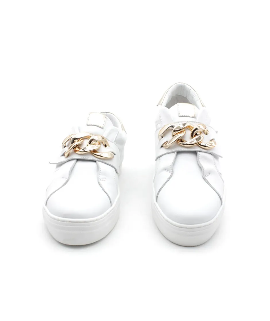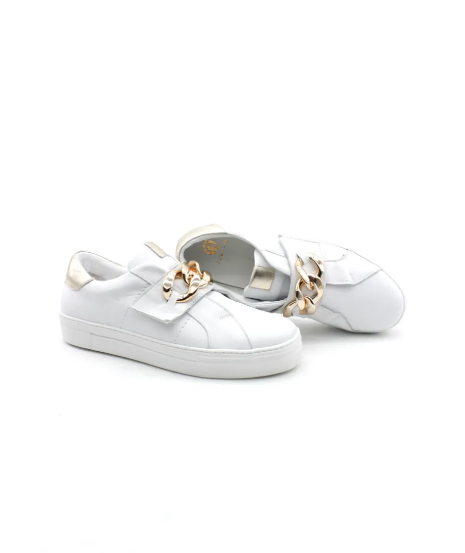 À la recherche d’une sneakers originale et tendance ? Fugitive, maison française reconnue pour ses créations moderne vous dévoile sa dernière création, MUCIA en cuir blanc et or. Montée sur une semelle compensée de 3 cm, elle laisse de côté le traditionnel lacet pour un velcro habillé d’un bijoux à la mode. Avec son look audacieux, elle sera la star de votre shoesing, alors n’attendez plus !