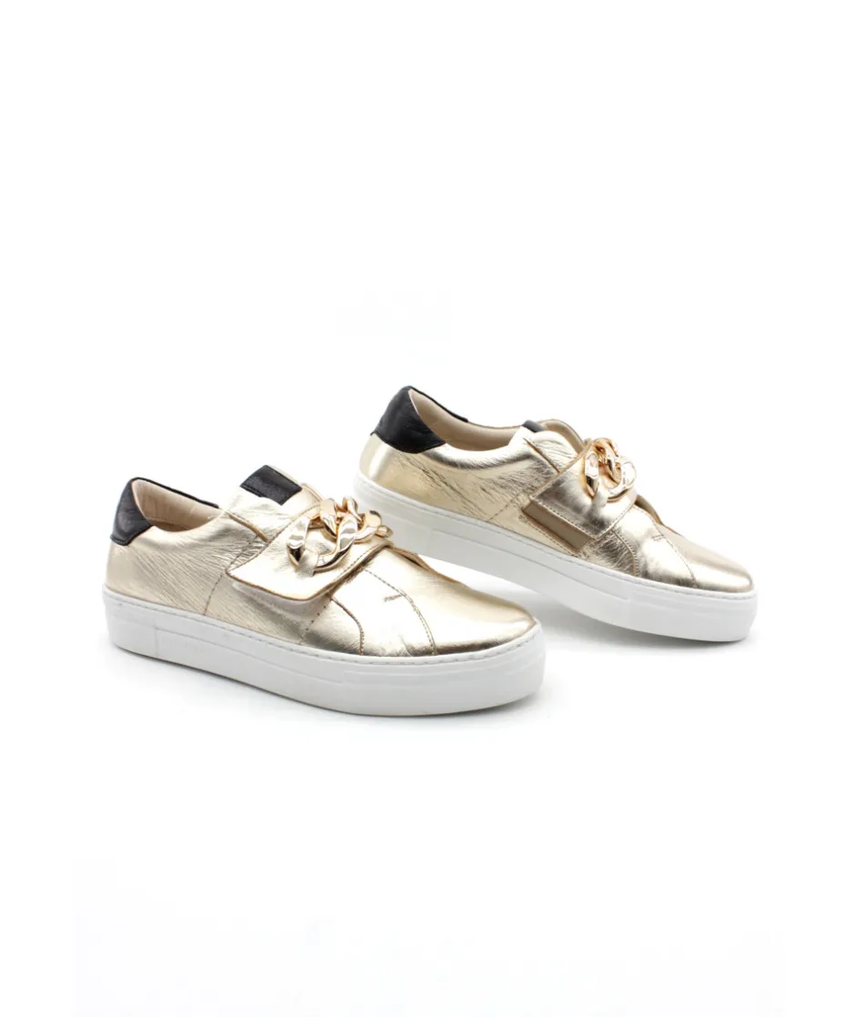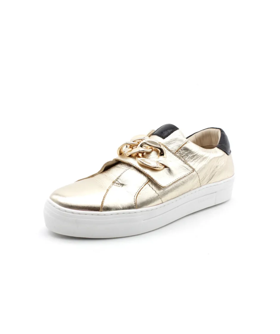 À la recherche d’une sneakers originale et tendance ? Fugitive, maison française reconnue pour ses créations moderne vous dévoile sa dernière création, MUCIA en cuir blanc et or. Montée sur une semelle compensée de 3 cm, elle laisse de côté le traditionnel lacet pour un velcro habillé d’un bijoux à la mode. Avec son look audacieux, elle sera la star de votre shoesing, alors n’attendez plus !