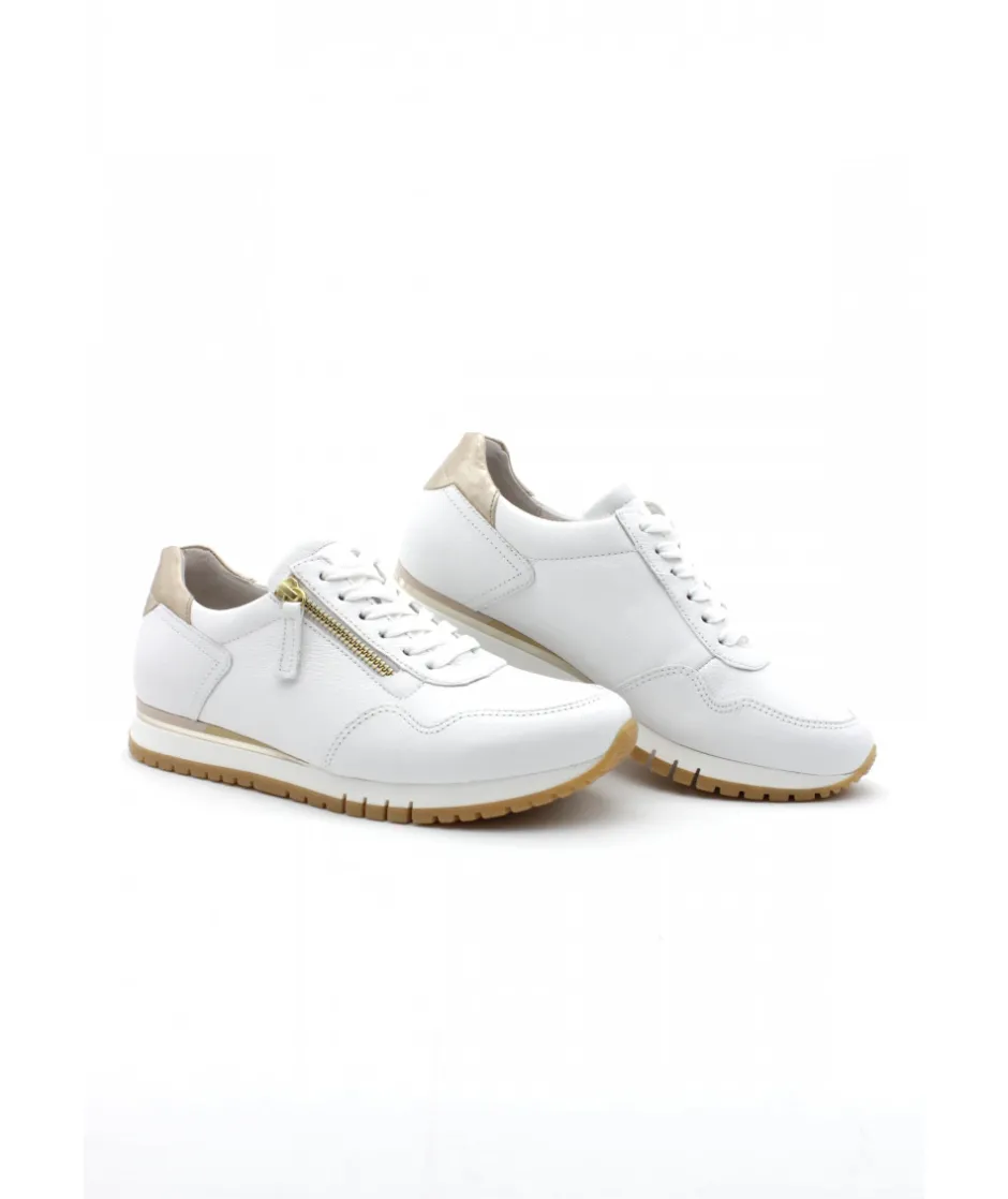La maison allemande GABOR nous dévoile sa dernière création, le modèle 86.378.51 dans son coloris blanc (disponible également en bleu) qui vous fera craquer par sa légèreté et son confort de marche. Avec une semelle amovible, un zip de fermeture et un lacet ces sneakers sport chic deviennent le modèle pratique et tendance qu’il vous faut !