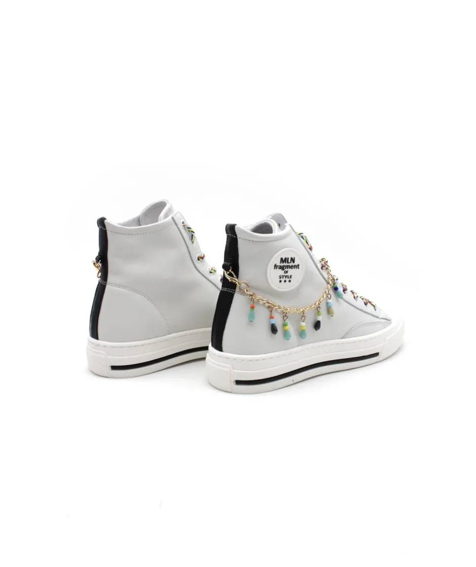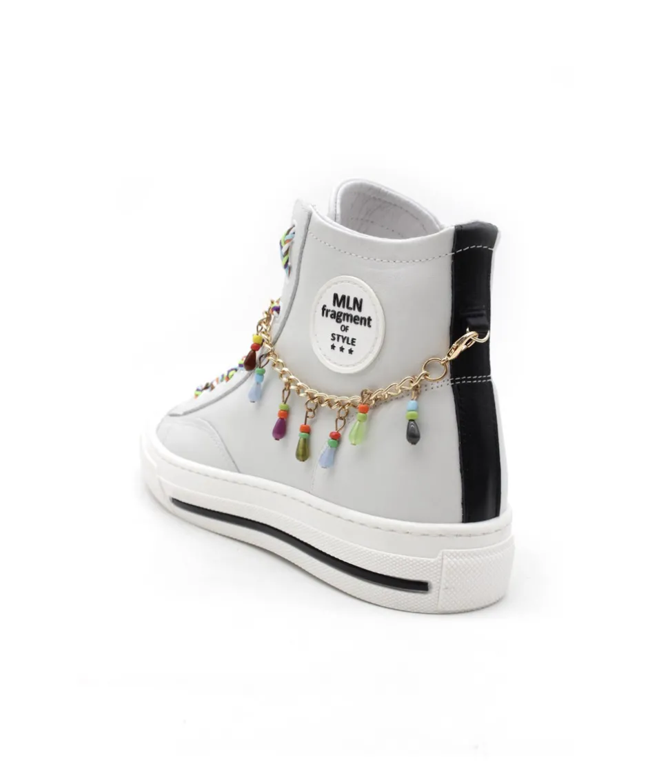 La maison italienne MELINE fait son retour cette année avec de nouvelles créations toujours plus originales ! Et voici le modèle HE202-CAT3 en couleur blanc. Une basket montante sport / chic pour tous les jours avec un super look. Avec ses lacets originaux, sa chaine doré amovible accompagnée de bijoux multicouleurs, cette sneaker pourra facilement s’associée à vos tenues tout en profitant d’un style sobre mais unique.