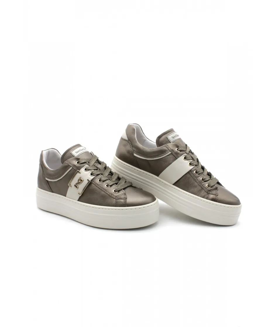 Énorme coup de coeur sur ce modèle de basket NEROGIARDINI. Le modèle 05300 apporte un rayon de soleil sur son cuir bronze et noir grâce à ses oeillets couleur or. Légère et confortable, ces sneakers pour femmes au look casual chic vous ferons toutes craquer !