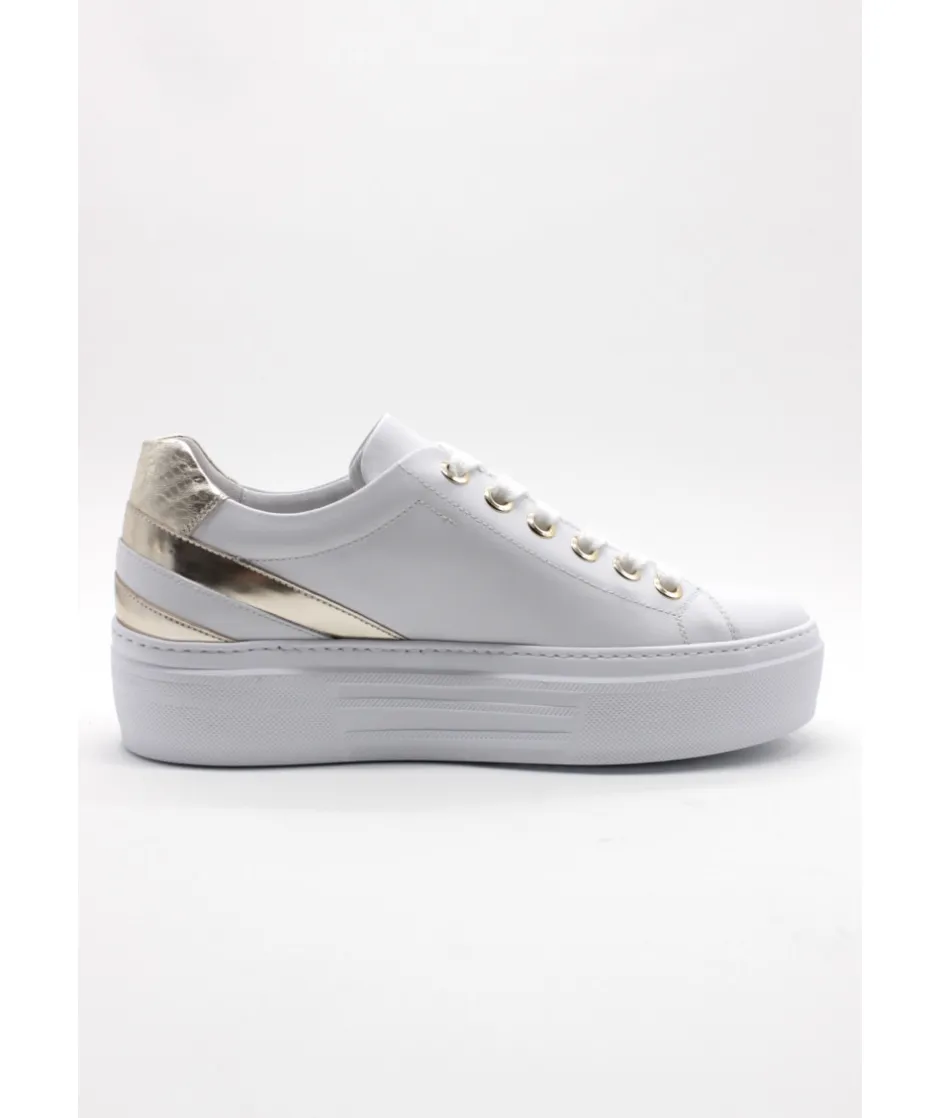 À la recherche d’une basket originale et atypique ? Voici le modèle 15303 de la maison italienne NEROGIARDINI dans son cuir couleur blanc. Assemblée sur une semelle épaisse de 4 cm, cette sneaker s’équipe d’un lacet pour un maintien optimal. On aime son contrefort, ses oeillets et son logo couleur dorée or qui apportent une finition soignée.