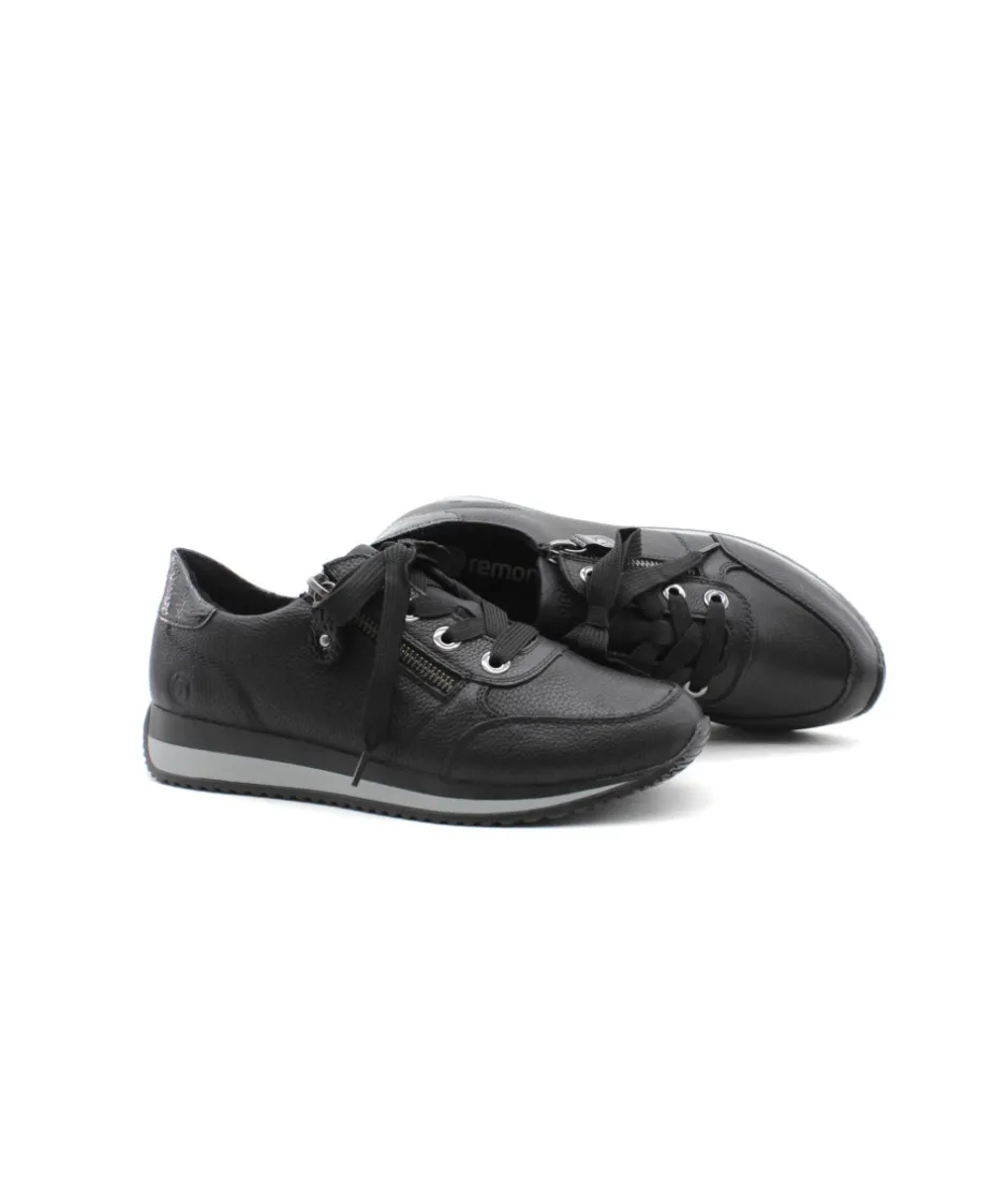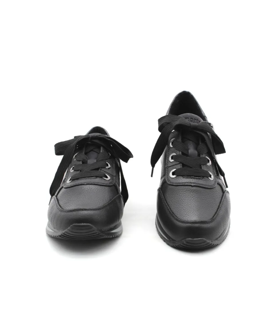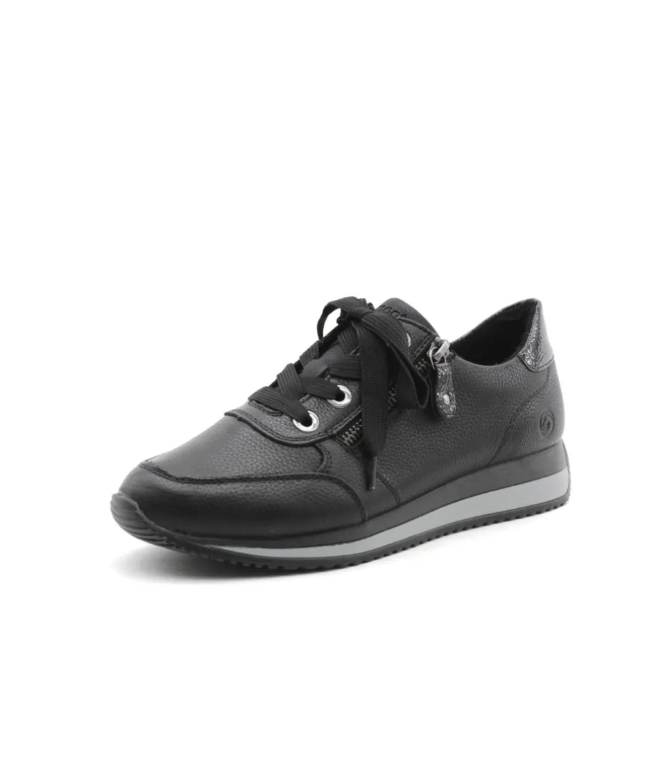 Cette basket Remonte D0H11-01 en cuir noir au look sportswear, en cuir grainé, soulignée par un empiècement vernis sur le contrefort. Parfaite pour assortir toutes vos tenues. Bonus : elle embarque avec elle la technologie Lite’N Soft : Plus de largueur sur la chaussure, semelle amovible, soutien de voute plantaire, légère et souple.