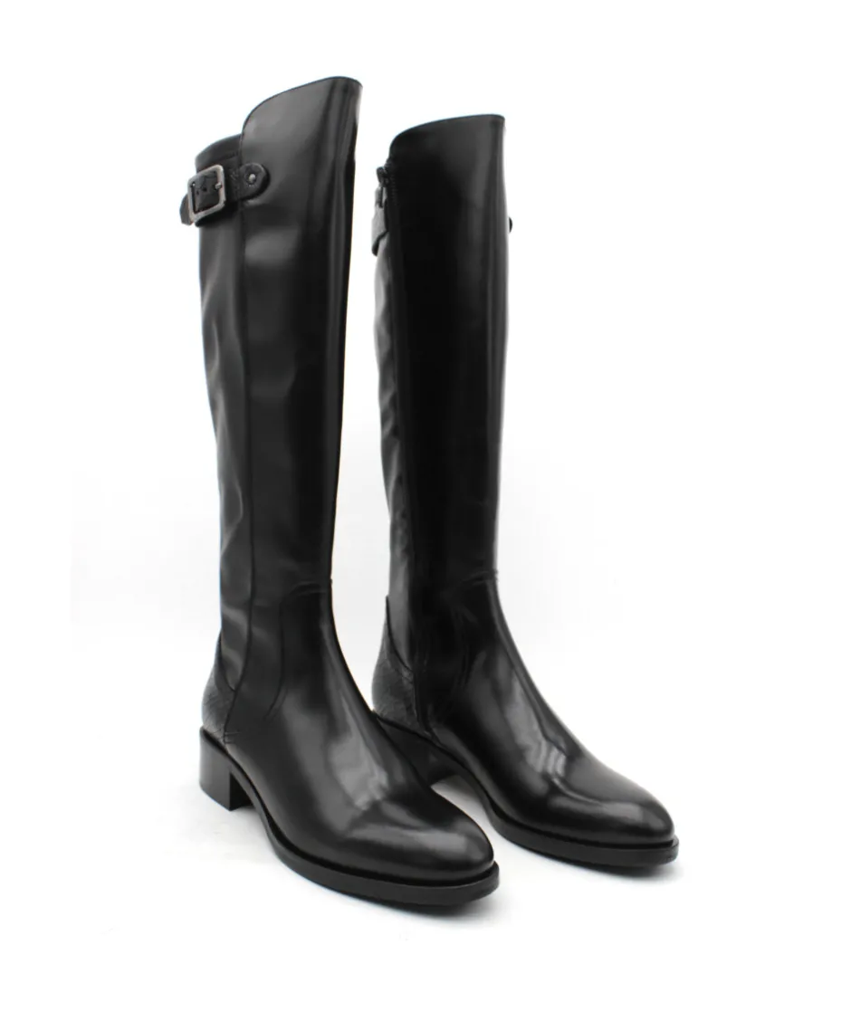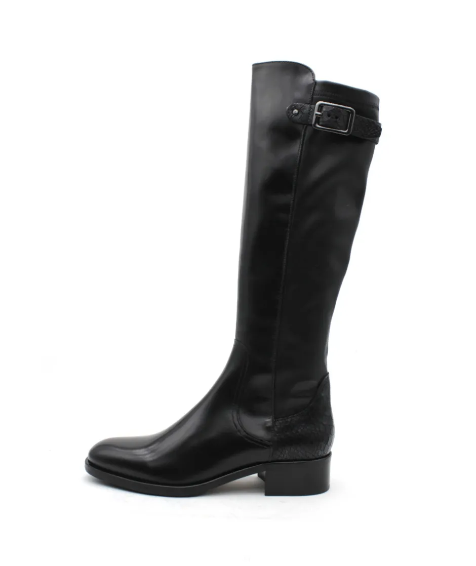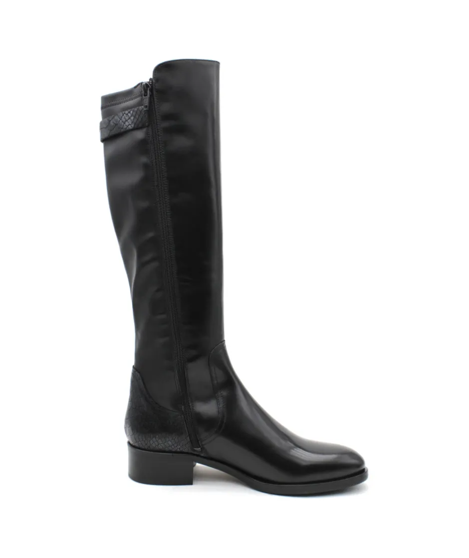 À la recherche d’une botte confortable, élégante et moderne ? Muratti a fait pour vous le modèle parfait : Rochemaure et son cuir lisse noir haut de gamme, mélangé avec des empiècements en cuir croco pour une touche d’originalité. Son galbe parfait épousera votre mollet tandis que son zip intérieur vous facilitera l’enfilage. Montée sur un talon de 4 cm, cette botte vous suivra toute la journée et s’adaptera facilement à votre garde robe. Pas de doute, c’est elle qui manque à votre shoesing cet hiver.