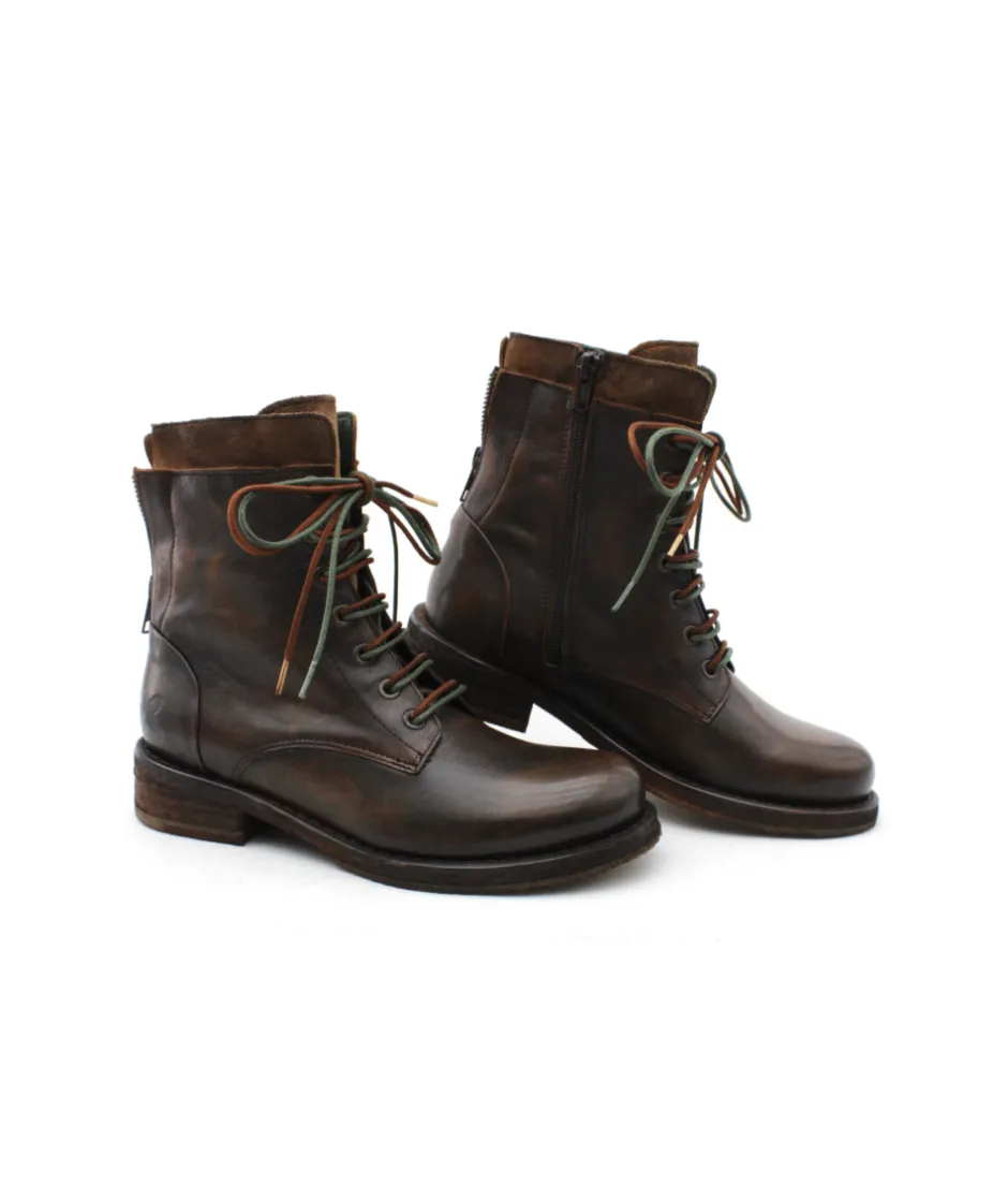 Le modèle D175 de la maison Felmini fait son apparition cette saison avec son cuir couleur marron cognac. Un look rangers vintage, accompagné d’un double lacet vert et orange original, le tout assit sur un petit talon qui permet d’obtenir un produit mode et confort. Réglable avec son lacet, souple avec sa semelle en gomme flexible, c’est la bottine à tout faire par excellence ! Le petit plus ? Le zip intérieur rajouté pour la praticité.