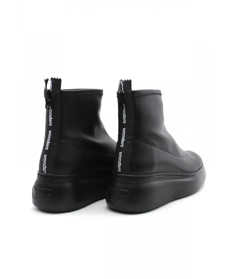Magnifique bottine compensée dessinée par la maison espagnole WONDERS, voici la A2622 en cuir noir. On aime son look ultra-atypique grâce à son zip intégré dans la languette sur le contrefort et sa semelle compensée de 5 cm, pas de doute… vous êtes sur de ne pas passer inaperçu ! Légère, confortable et souple, vous ne pourrez plus vous en passer, alors n’hésitez pas une seule seconde !