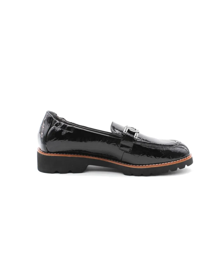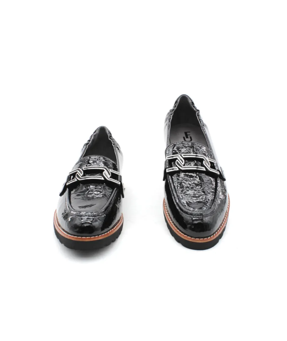 Nouvelle création de la maison française Fugitive avec ce mocassin en cuir vernis noir CYCLOUN. Un look moderne et féminin grâce à sa semelle en gomme légère, son cuir vernis et sa barrette. Énorme tendance, le mocassin se fait une place de choix dans le shoesing des femmes ces dernières années. Chic et raffiné, comme vous, ces chaussures s’associeront facilement à vos robes, jupes, pantalons à pinces…