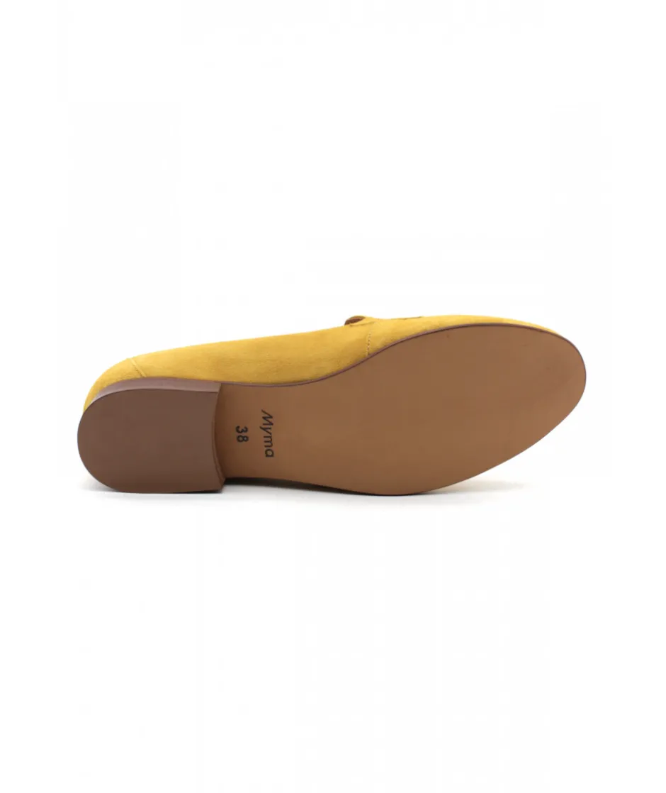 Joli mocassin en cuir velours perforé jaune chic et confortable. L’Empreinte Chaussures vous dévoile le nouveau modèle 5415/00 de la maison française MYMA et qui plaît déjà aux femmes à la recherche de modernité et d’élégance. Ce mocassin est une véritable pépite avec sa semelle fine en gomme pour sa légèreté et son confort ainsi que sa patte sur le dessus du pied pour un rendu féminin.