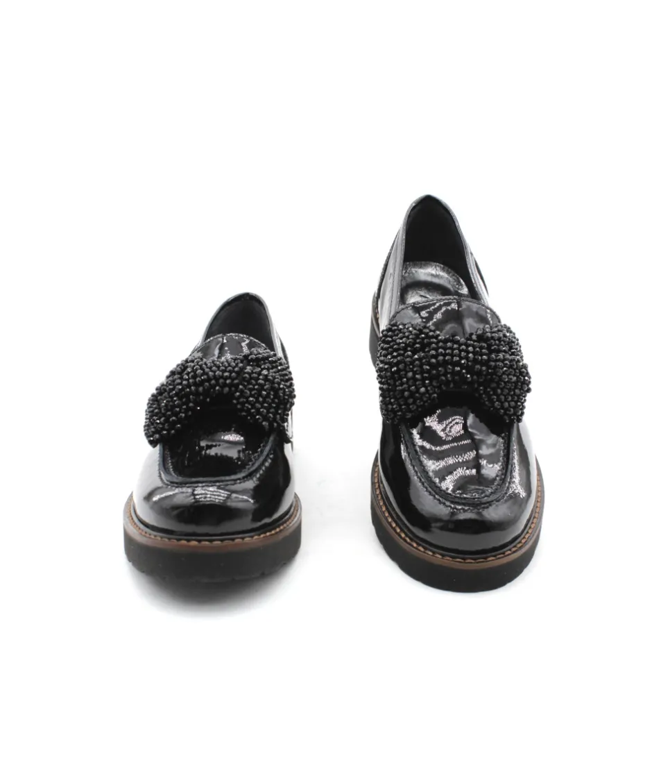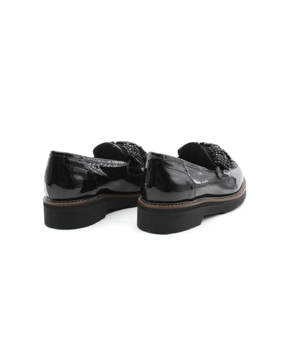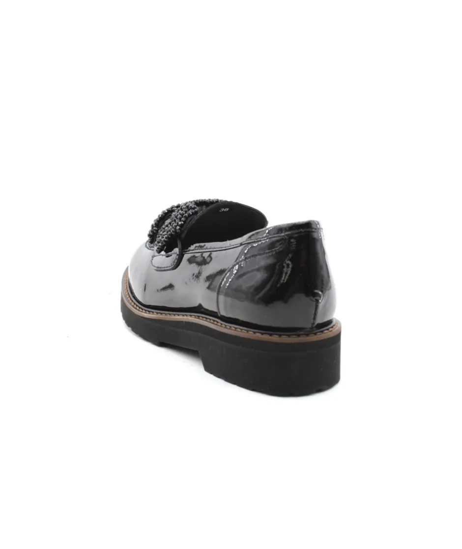Nouvelle création de la maison française Myma avec ce mocassin en cuir vernis noir 5815/00. Un look moderne et féminin grâce à sa semelle épaisse, son cuir vernis et son noeud orné de strass. Énorme tendance, le mocassin se fait une place de choix dans le shoesing des femmes ces dernières années. Chic et raffiné, comme vous, ces chaussures s’associeront facilement à vos robes, jupes, pantalons à pinces…