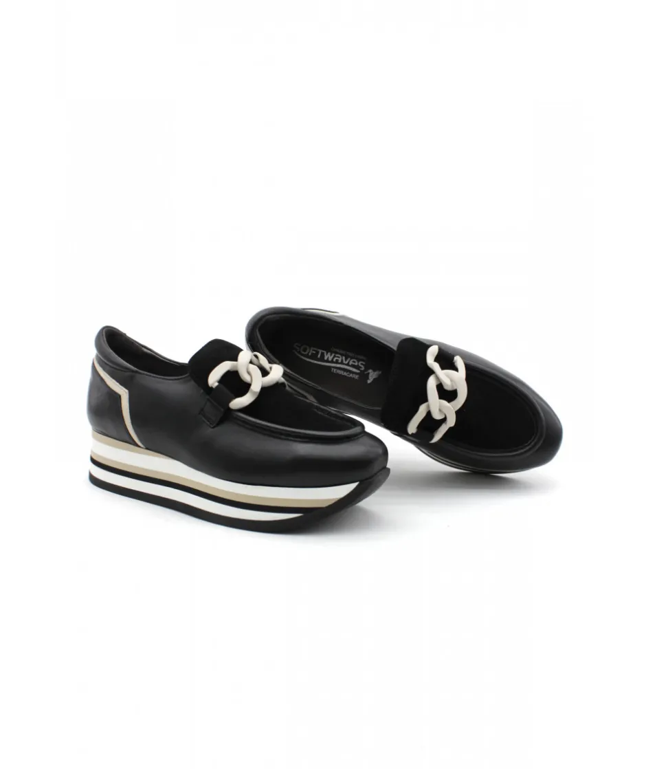 SOFTWAVES propose le mocassin 7.78.50/05 en cuir noir pour les femmes soucieuses du bien-être de leurs pieds mais sans négliger pour autant le style. Véritable chaussures confortable et élégante, cette nouveauté associe une semelle de basket sur une forme mocassin, du jamais vu jusqu’à présent ! Ses élastiques situés sous la languette vous offrirons beaucoup de maintien lors de la marche.