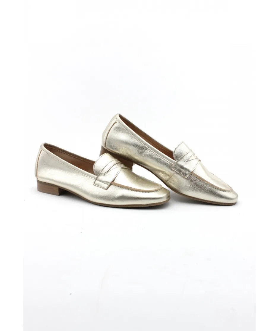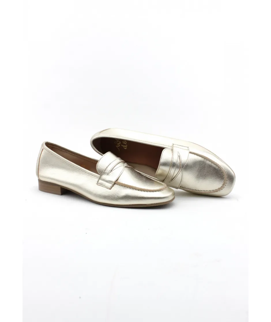 WE DO, une nouvelle marque chez L’Empreinte Chaussures, propose cette saison un mocassin très féminin en cuir platine or, décoré d’un empiècement en cuir chic sur le dessus du plateau.