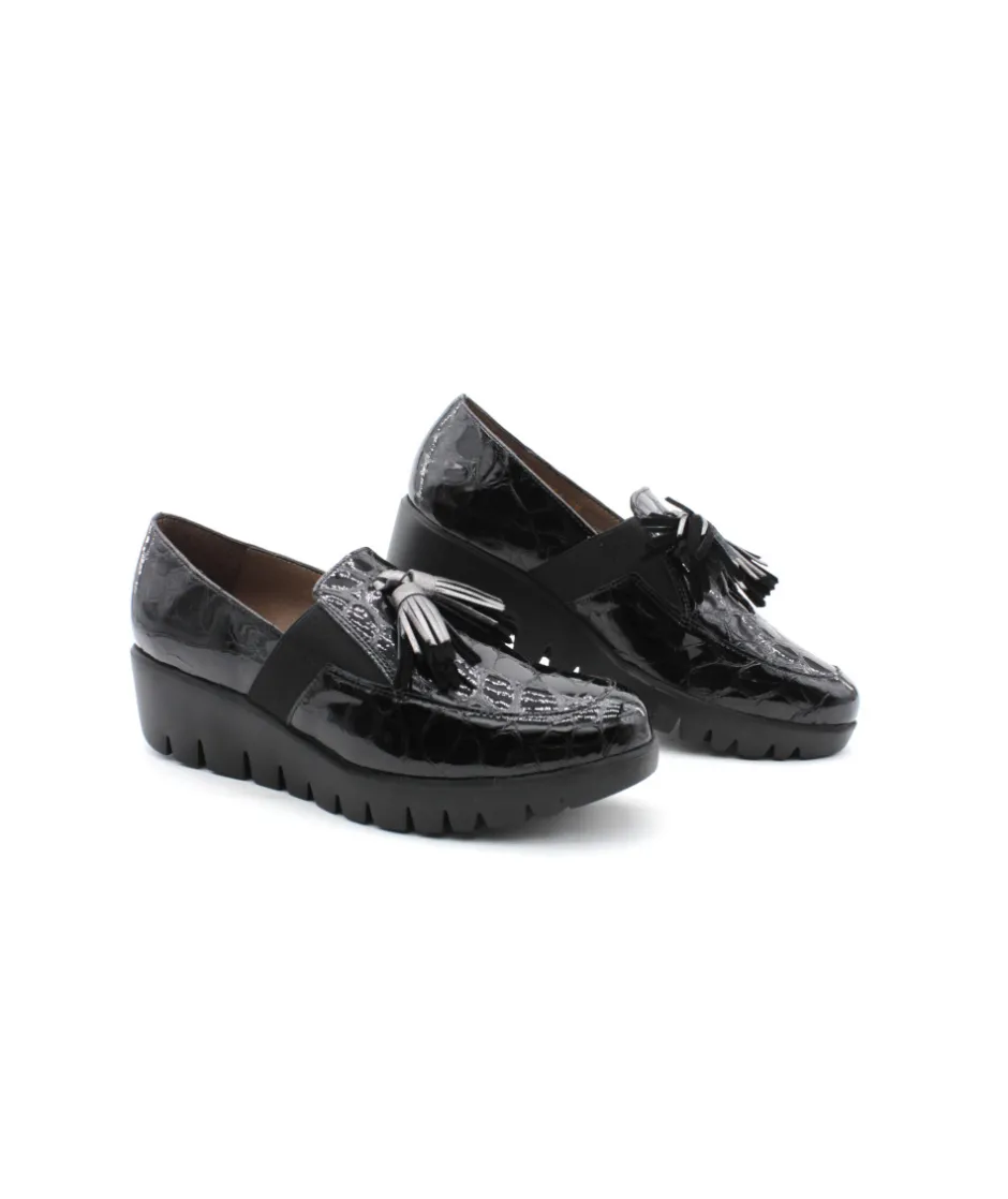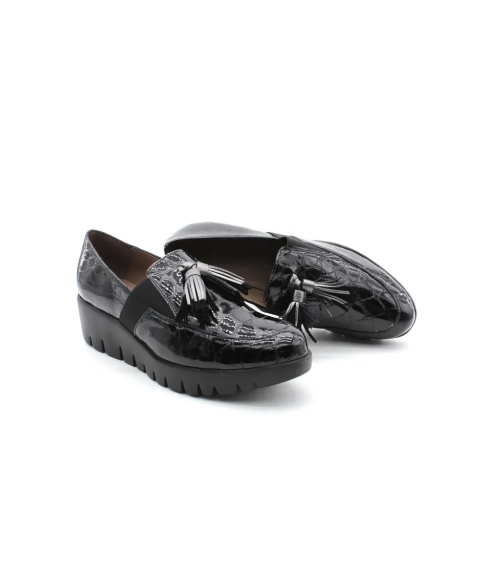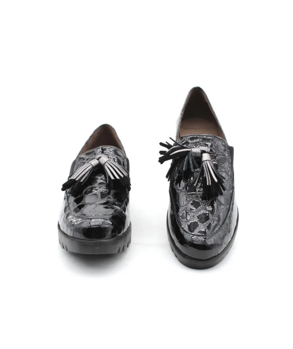 Joli mocassin en cuir vernis noir proposé par la maison espagnole Wonders. Le modèle C33254 casse les codes pour un look original et atypique, montée sur une semelle compensée, cette chaussure vous accompagnera partout grâce à son confort de marche. On aime les glands en cuir présent sur le plateau avant qui apporte de l’élégance au mocassin.