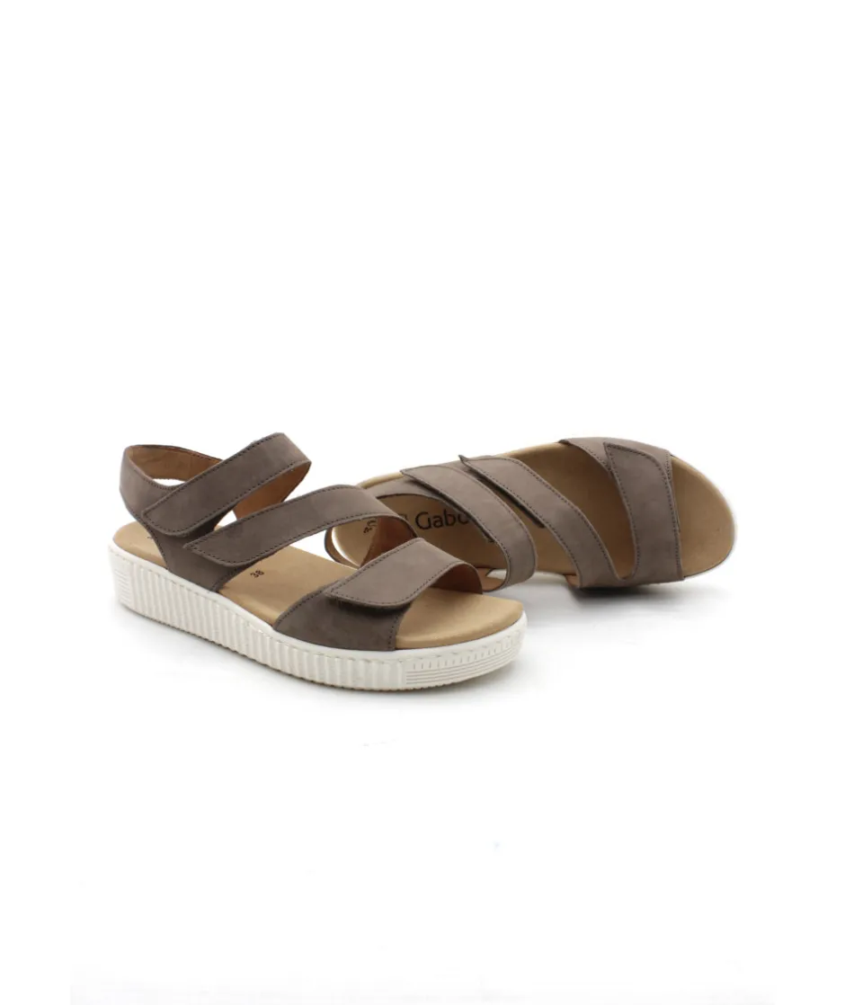 Cette saison, GABOR revient avec ces nu-pieds pour femme ultra-confortable et réglable à souhait. Le modèle 23.600.18 en cuir velours taupe embarque avec lui un serrage par velcro sur chacune de ses brides.