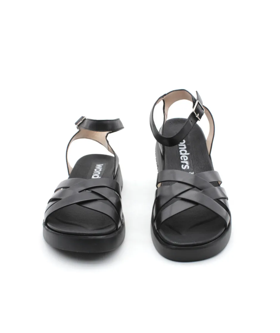 Magnifique sandale sur un bloc compensé de 3,5 cm. Voici la dernière création de la maison espagnole WONDERS avec son modèle C6521 disponible en cuir noir. Sa semelle, légère et confortable apporte un véritable look moderne et tendance tandis que ses brides croisées avant apporterons un look rétro chic. On aime sa bride arrière réglable qui apporte du maintien lors de la marche. Il ne vous reste plus qu’à profiter !