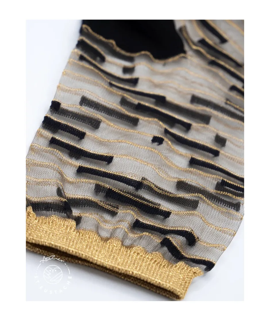 Shinjuku Gold. Les paillettes dorées étincelantes contrastées par un noir profond illumineront vos tenues ! Modèle inspiré du quartier vibrant de Shinjuku.