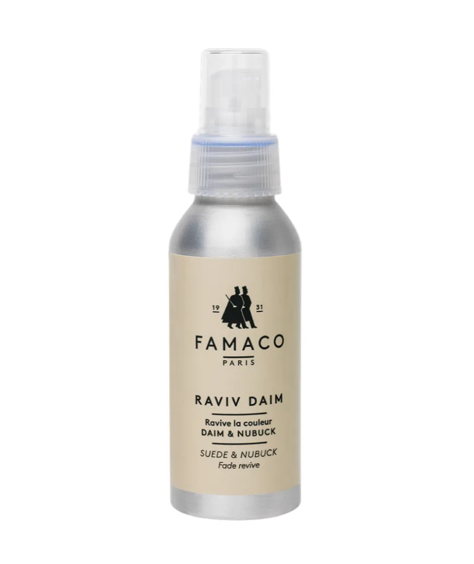 Retirer la poussière à l’aide d’une brosse Famaco. Appliquer le Raviv’ Daim sur la chaussure à une distance de 20 cm environ. Brosser avec une brosse crêpe pour que la matière retrouve son velouté.