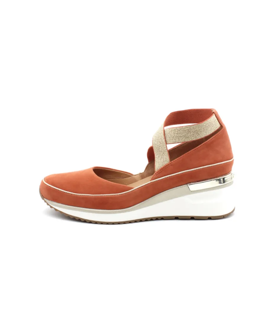 Dans un cuir velours orange et beige, ces ballerines s’assortirons facilement à votre garde robe (jupes, robes, pantalons,…) Ses brides élastiquées maintiendrons votre pied dans la chaussure tandis que sa semelle compensée vous offrira la cambrures parfaite.