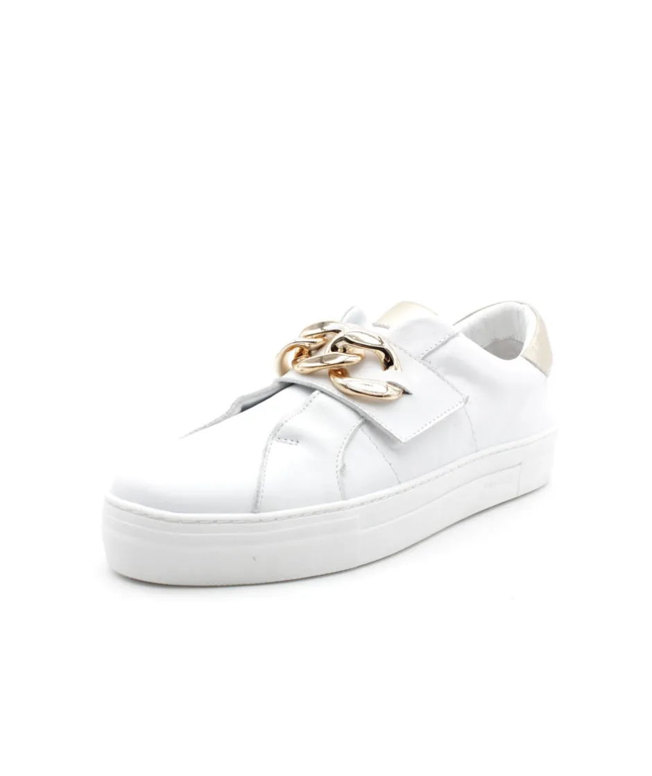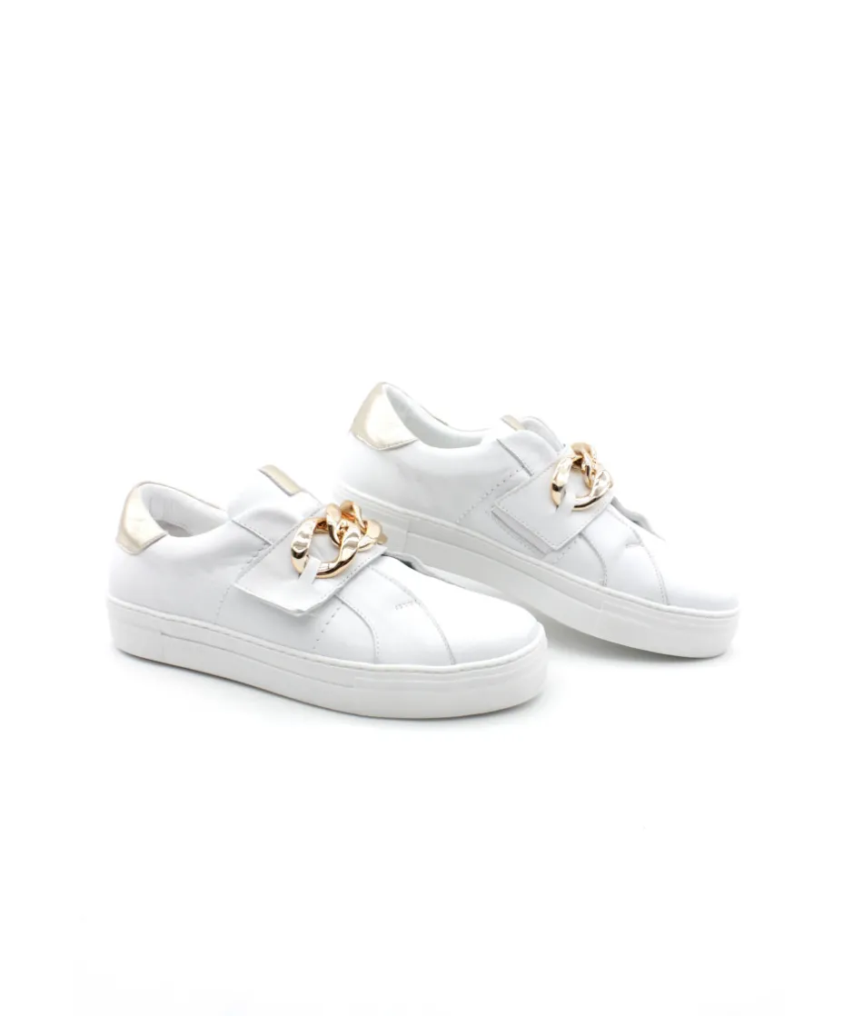 À la recherche d’une sneakers originale et tendance ? Fugitive, maison française reconnue pour ses créations moderne vous dévoile sa dernière création, MUCIA en cuir blanc et or. Montée sur une semelle compensée de 3 cm, elle laisse de côté le traditionnel lacet pour un velcro habillé d’un bijoux à la mode. Avec son look audacieux, elle sera la star de votre shoesing, alors n’attendez plus !