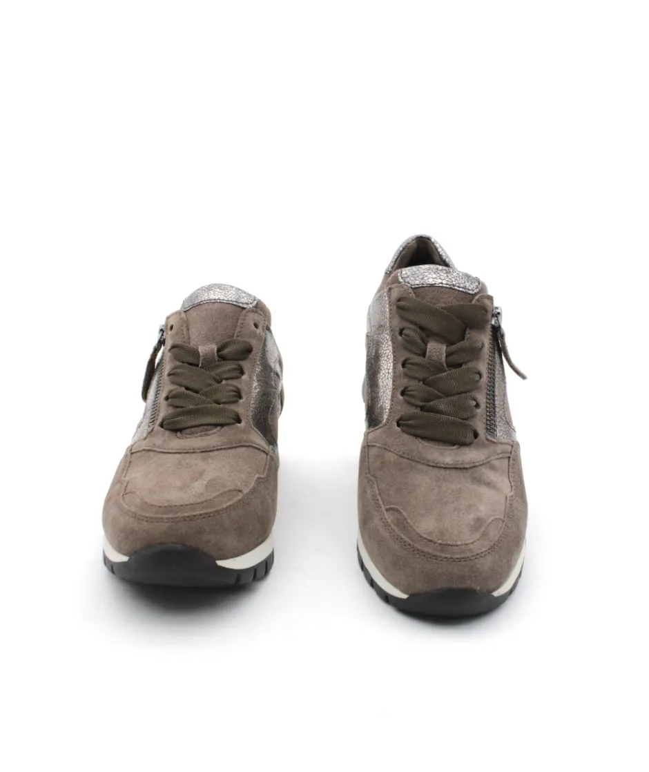 À chaque femme sa paire de basket. Cette fois, nous vous présentons la nouvelle GABOR 36.438.30 en cuir velours taupe accompagnée d’empiècements en cuir lisse et croco métallisé. Chic et élégante, cette paire de sneaker confortable se montre à l’aise dans toutes les situations grâce à sa semelle rainurée qui offre beaucoup de souplesse. Son lacet viendra s’ajuster à votre pied tandis que ses zips de fermetures vous faciliteront l’enfilage. Plus de doute, c’est la paire qu’il vous faut !