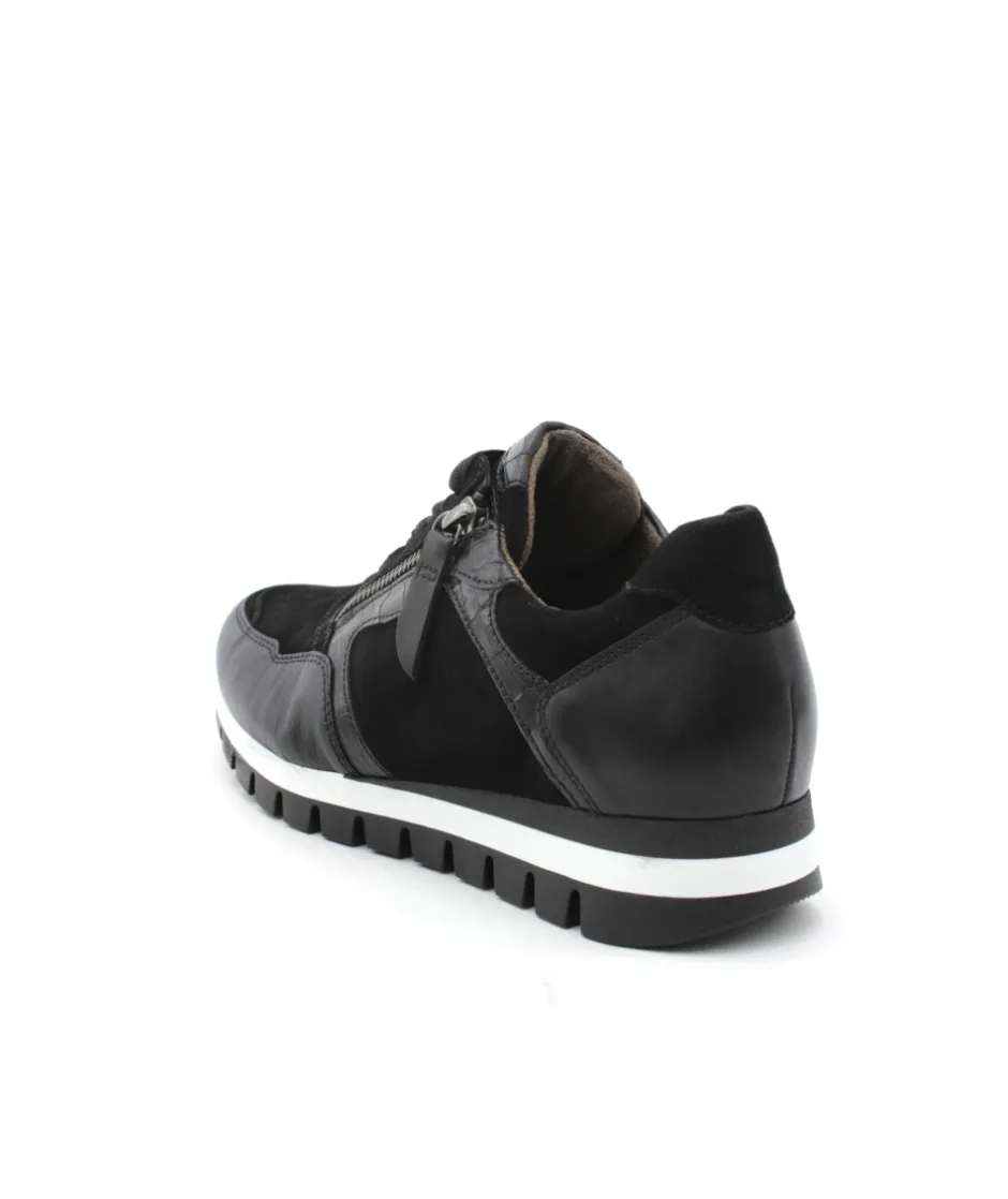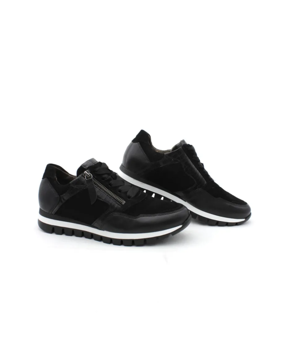 À chaque femme sa paire de basket. Cette fois, nous vous présentons la nouvelle GABOR 36.438.67 en cuir velours noir accompagnée d’empiècements en cuir lisse et croco. Chic et élégante, cette paire de sneaker confortable se montre à l’aise dans toutes les situations grâce à sa semelle rainurée qui offre beaucoup de souplesse. Son lacet viendra s’ajuster à votre pied tandis que ses zips de fermetures vous faciliteront l’enfilage. Plus de doute, c’est la paire qu’il vous faut !
