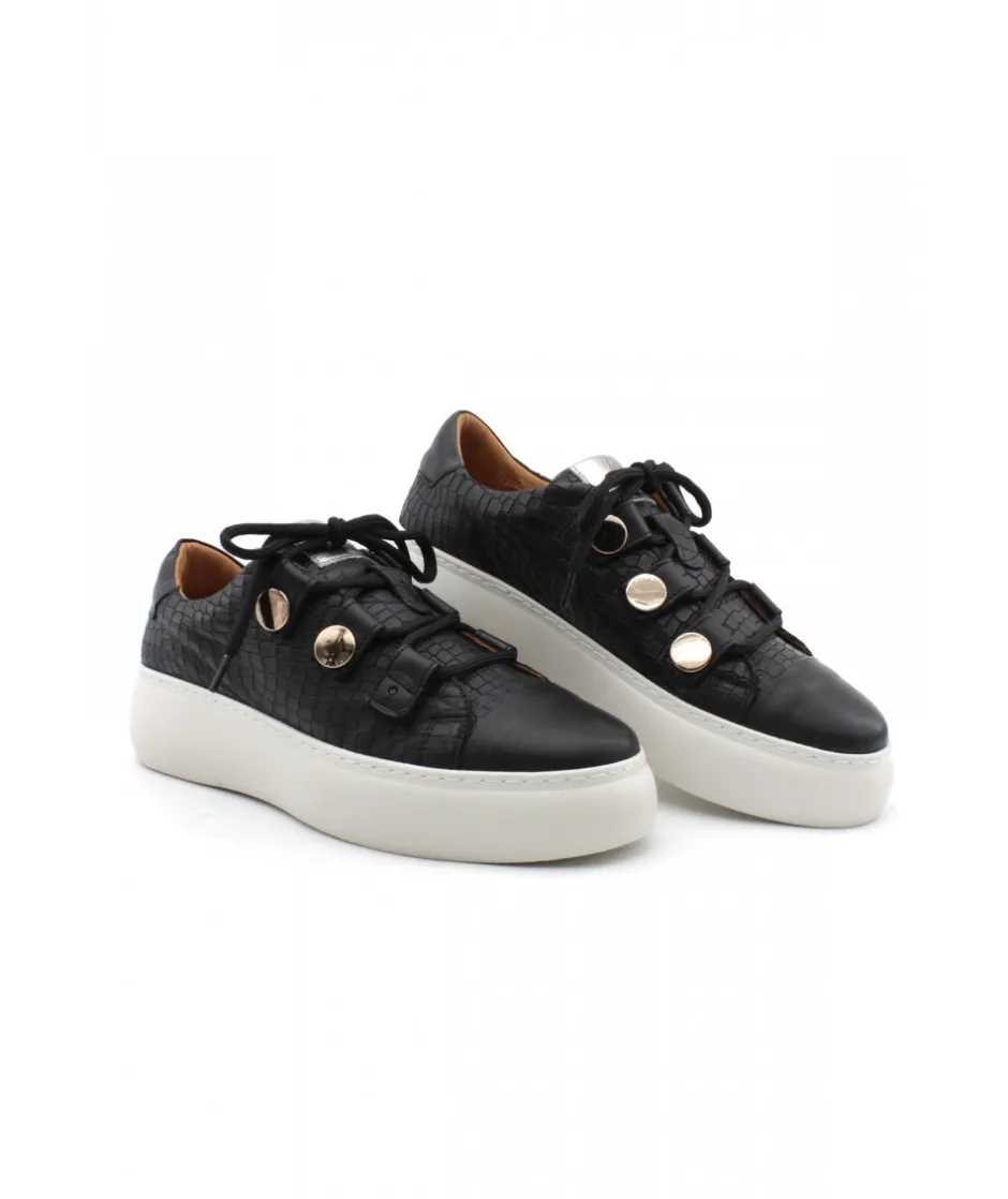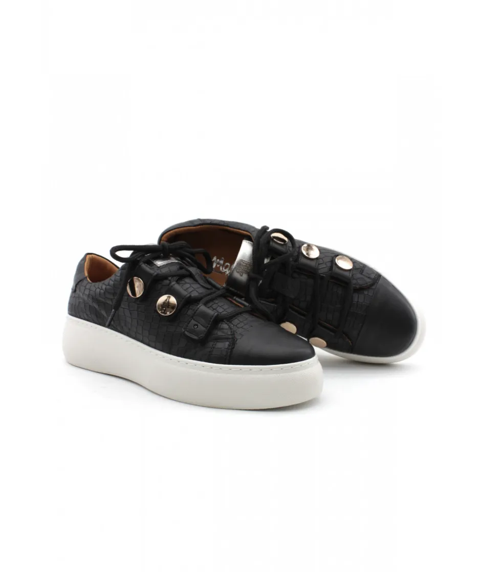 Avec cette basket ultra-originale, Mamzelle revient en force cette saison. Pleine de charme, la CAMIL mix les motifs sur son cuir camel et noir et s’assoit sur une semelle compensée blanche. Avec un joli laçage et des passant dorés, la féminité et l’élégance s’empare de cette sneakers pour femme. On apprécie la légèreté de sa semelle et le confort offert.