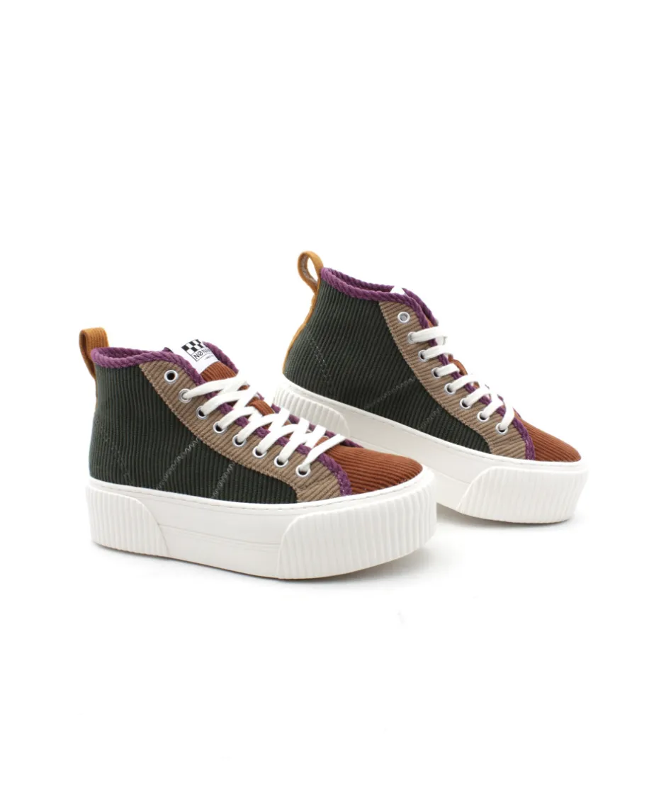 En s’inspirant de ses archives Punk, NO NAME nous dévoile son nouveau modèle l’IRON MID totalement délirant et atypique avec sa grosse semelle plateau et son revêtement en velours côtelé multicouleur. Kaki, beige, camel et violet, rien ne fait vous fait peur ? Pas de doute, avec ce modèle ça sera vous la modeuse au top ! La douceur du textile vous réserve un accueil chaleureux à chaque enfilage, un bonheur…