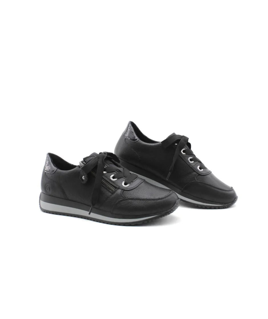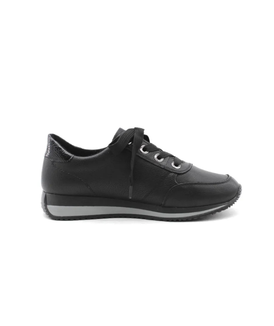 Cette basket Remonte D0H11-01 en cuir noir au look sportswear, en cuir grainé, soulignée par un empiècement vernis sur le contrefort. Parfaite pour assortir toutes vos tenues. Bonus : elle embarque avec elle la technologie Lite’N Soft : Plus de largueur sur la chaussure, semelle amovible, soutien de voute plantaire, légère et souple.