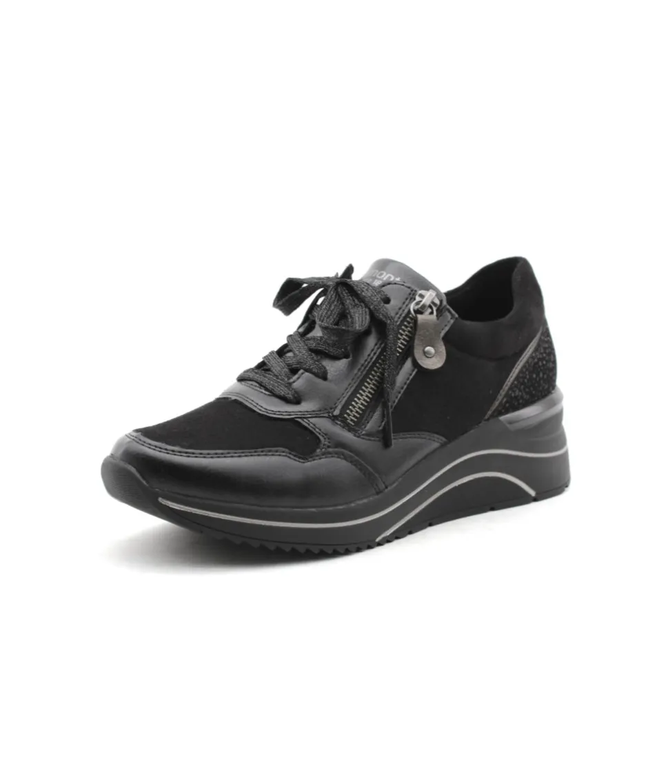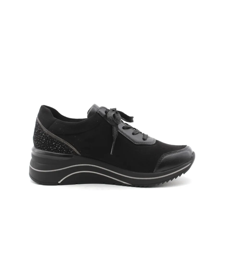 Cette basket compensés D0T01-01 dans sa version noir de Remonte à tout pour plaire, de plus, elle dispose d’une très bonne largeur. Grâce à son tissu stretch elle apporte un maximum de souplesse et de confort pour vos pieds. Doté d’un zip latéral ainsi que d’un lacet, enfiler votre basket n’a jamais été aussi facile. Bonus : elle embarque avec elle la technologie Lite’N Soft : Plus de largueur sur la chaussure, semelle amovible, soutien de voute plantaire, légère et souple.