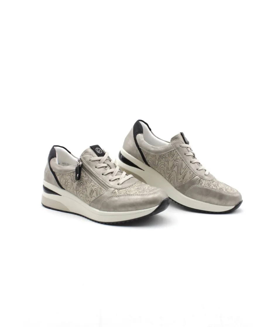 Pour se sentir libre, adopter Remonte !!! Remonte D2400-60 est une tennis femme en cuir couleur argent platine. Cette tennis Remonte est facile à chausser grâce à son lacet et sa fermeture éclair. Ce modèle de tennis Remonte est doté d’une semelle amovible matelassée et d’un talon compensé. Idéale pour le quotidien, cette tennis s’adaptera parfaitement avec toute votre garde robe. Bonus : elle embarque avec elle la technologie Lite’N Soft : Plus de largueur sur la chaussure, semelle amovible, soutien de voute plantaire, légère et souple.