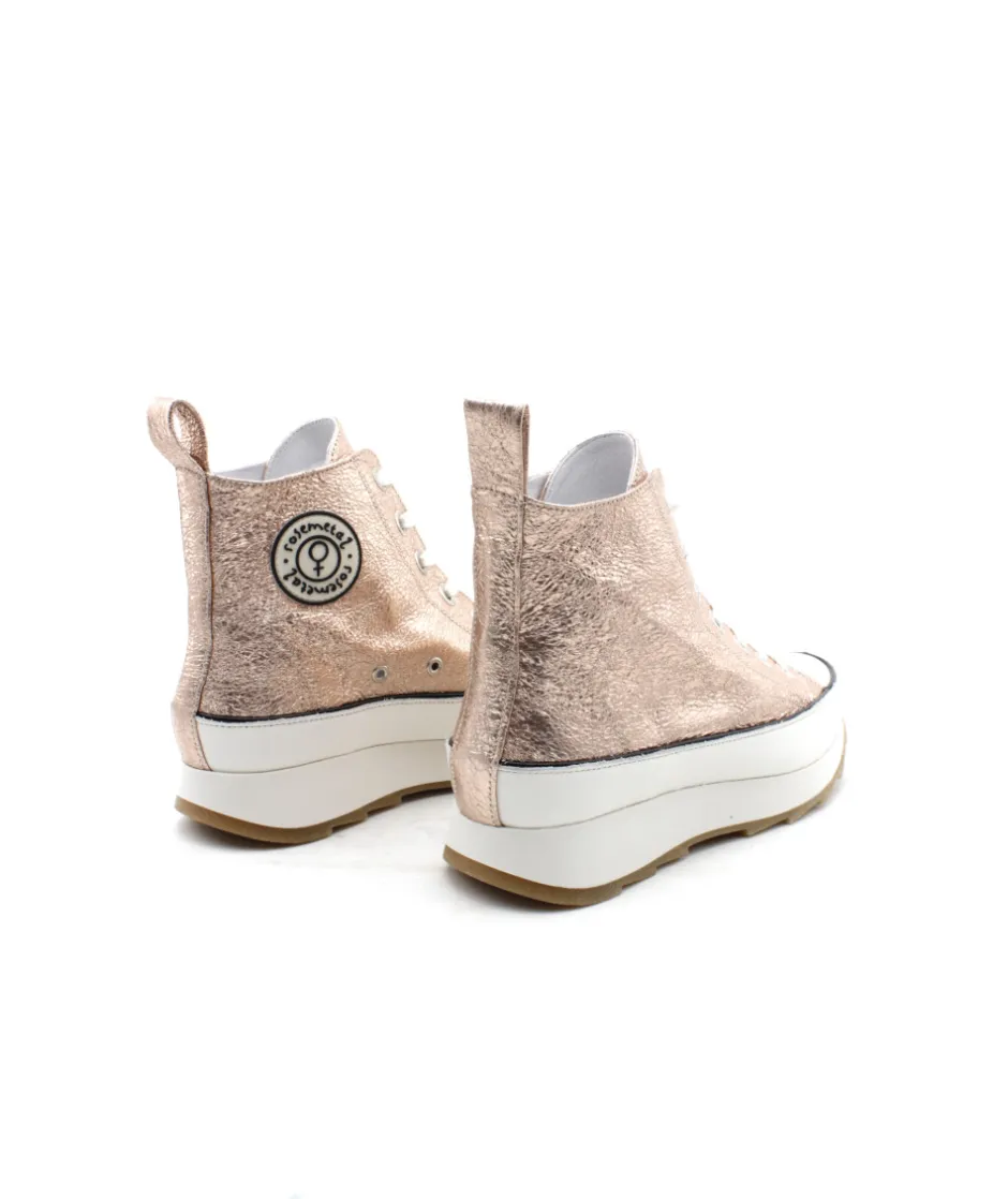 FRASNE H0756B, une basket ultra-originale pour un look tendance, voici la création de ROSEMETAL. Sur une grosse semelle compensée et une palette de couleur disponible, la mode est à vos pieds ! Une semelle blanche imposante, un dessus en cuir métallisé nude… pas de doute c’est le must-have de cet saison ! Confortable et looké, on aime le logo sur le côté pour le petit plus !