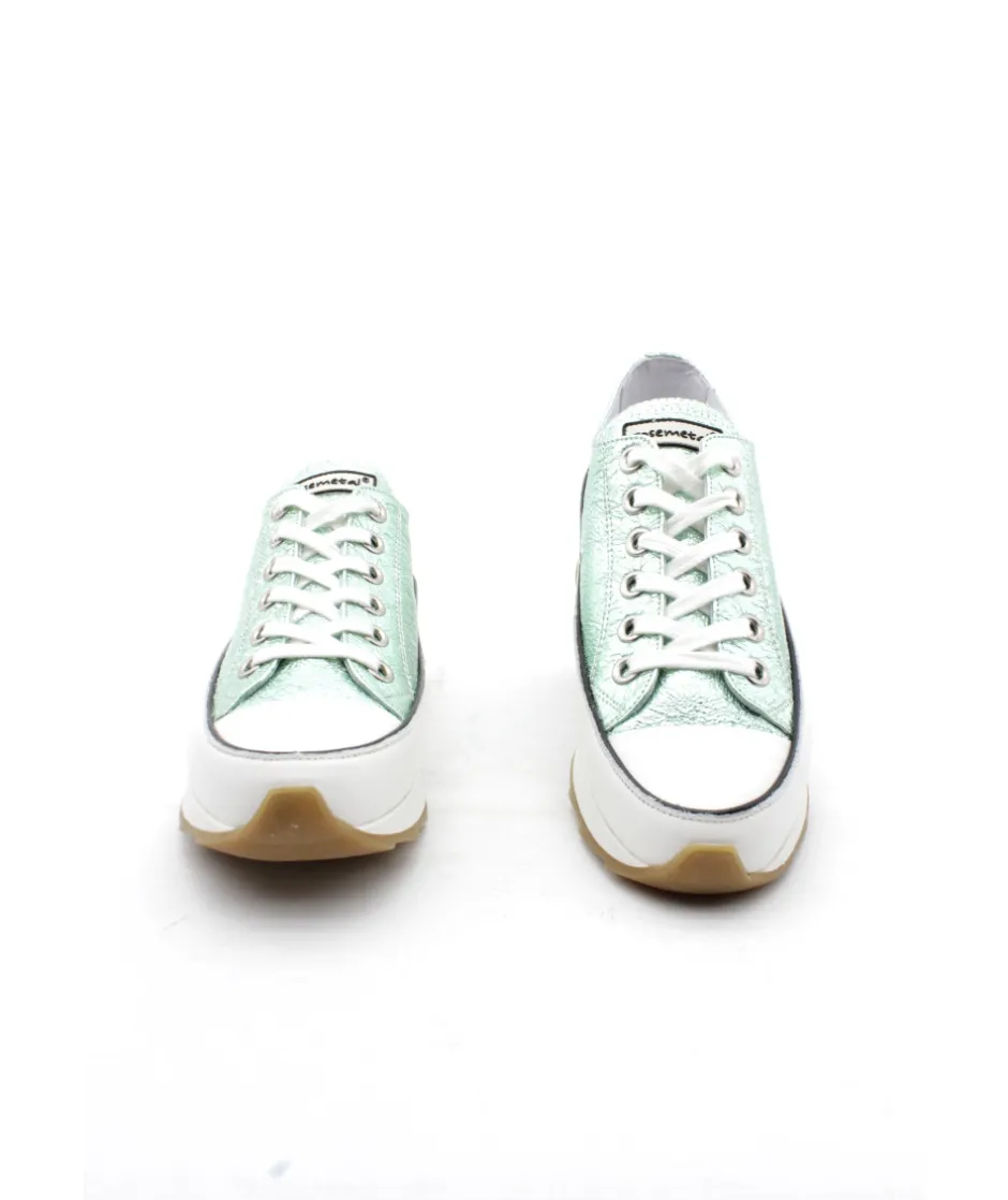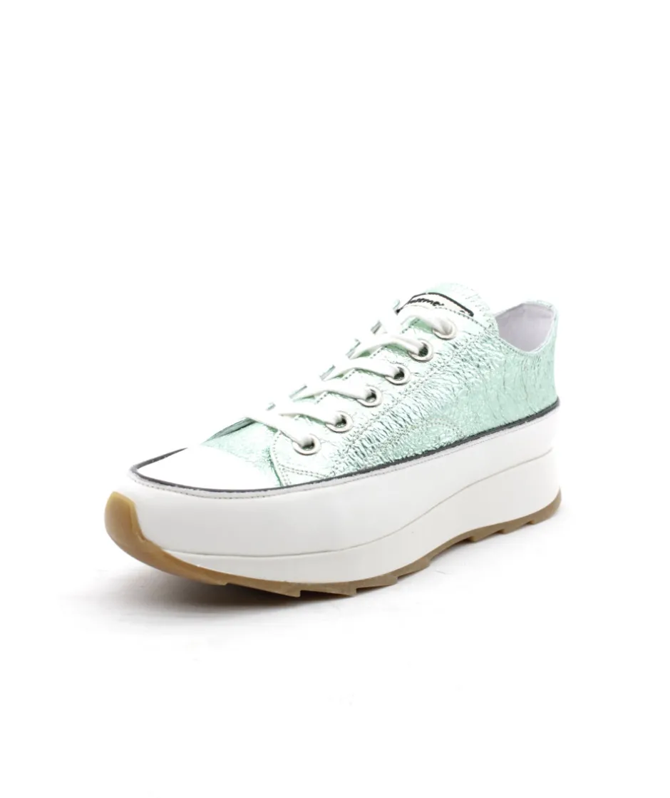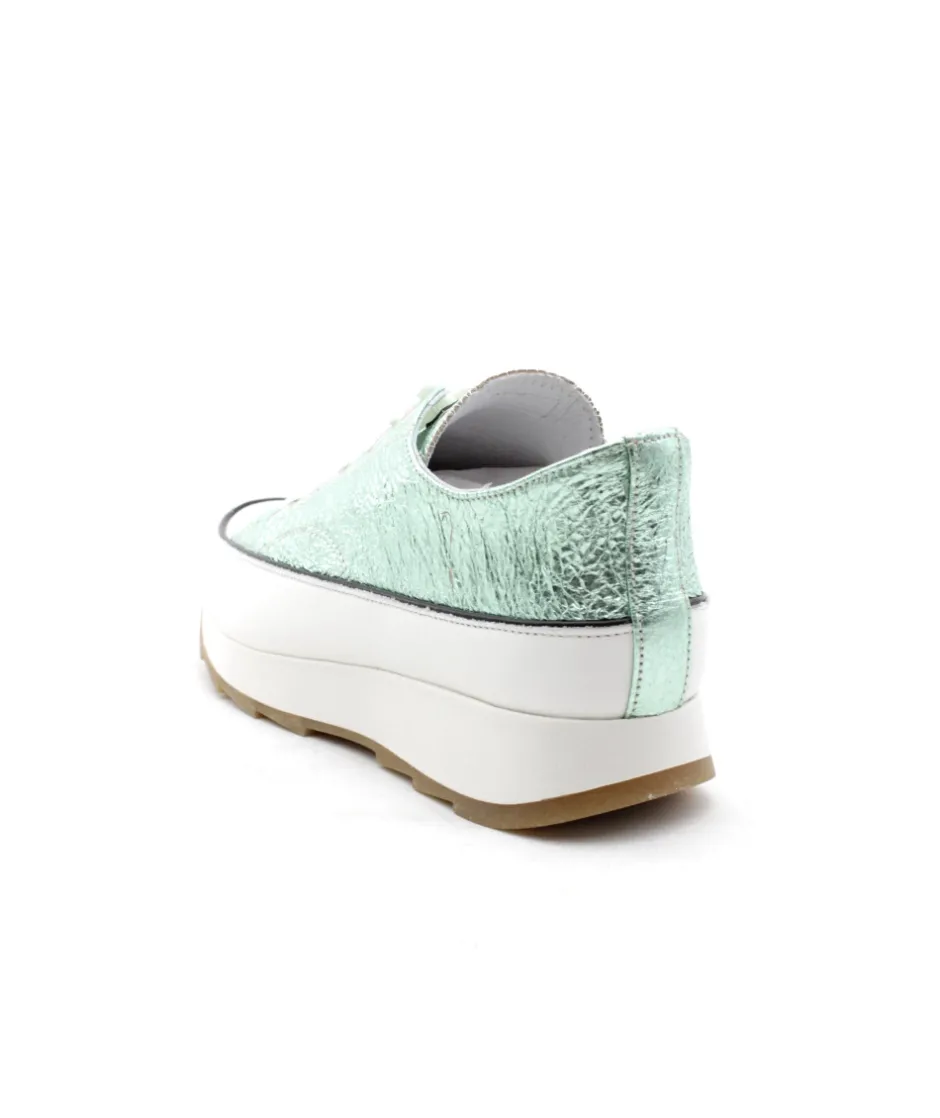 FRASSETO H0755B, une basket ultra-originale pour un look tendance, voici la dernière création de ROSEMETAL. Sur une grosse semelle compensée et une palette de couleur disponible, la mode est à vos pieds ! Une semelle blanche imposante, un dessus en cuir métallisé platine et vert, pas de doute c’est le must-have de cet été ! Confortable et looké, on aime la semelle marron au style rétro !