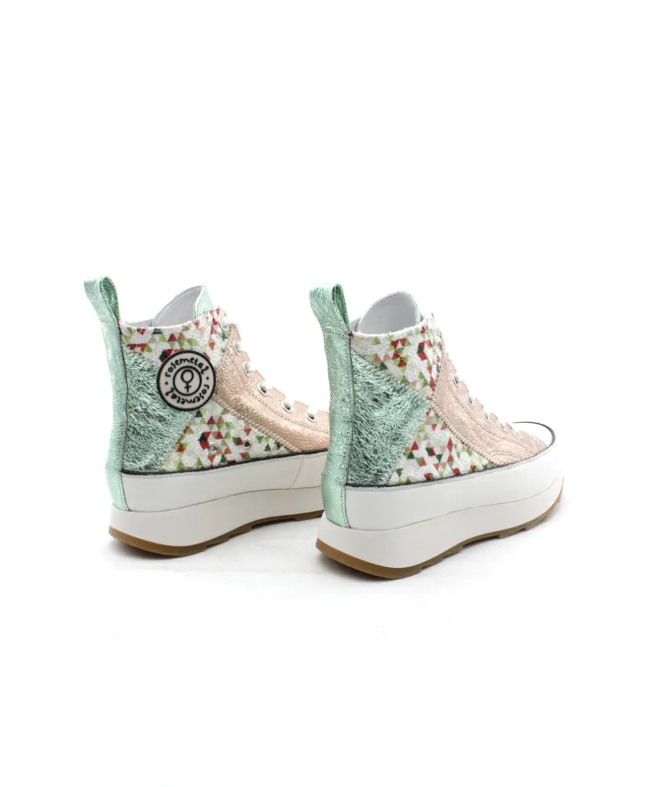 FRECHEDE, une basket ultra-originale pour un look tendance, voici la création de ROSEMETAL. Sur une grosse semelle compensée et une palette de couleur disponible, la mode est à vos pieds ! Une semelle blanche imposante, un dessus en cuir métallisé rose et vert,… pas de doute c’est le must-have de cet saison ! Confortable et looké, on aime le logo sur le côté pour le petit plus !