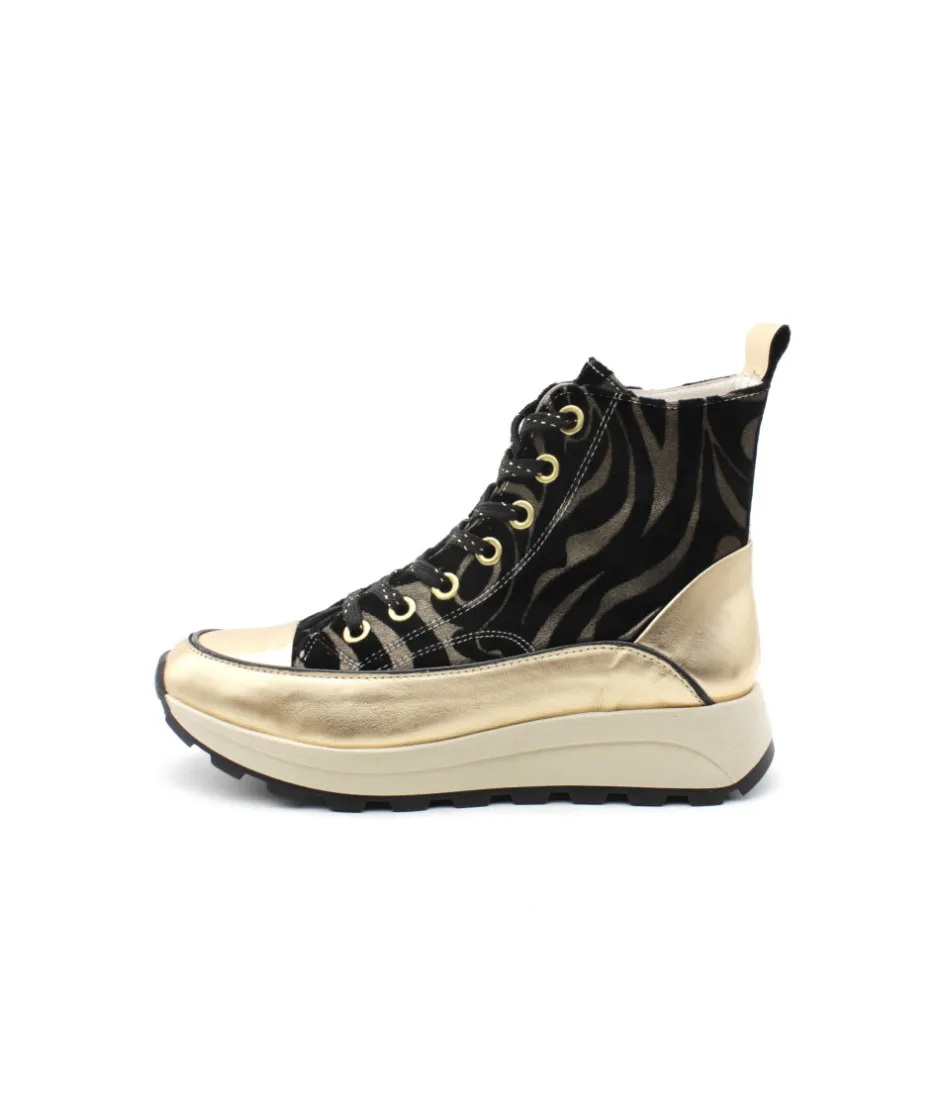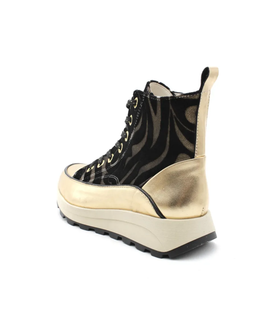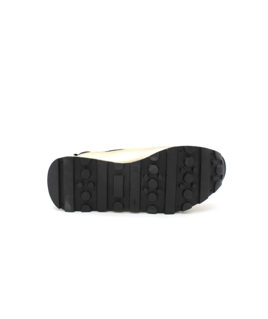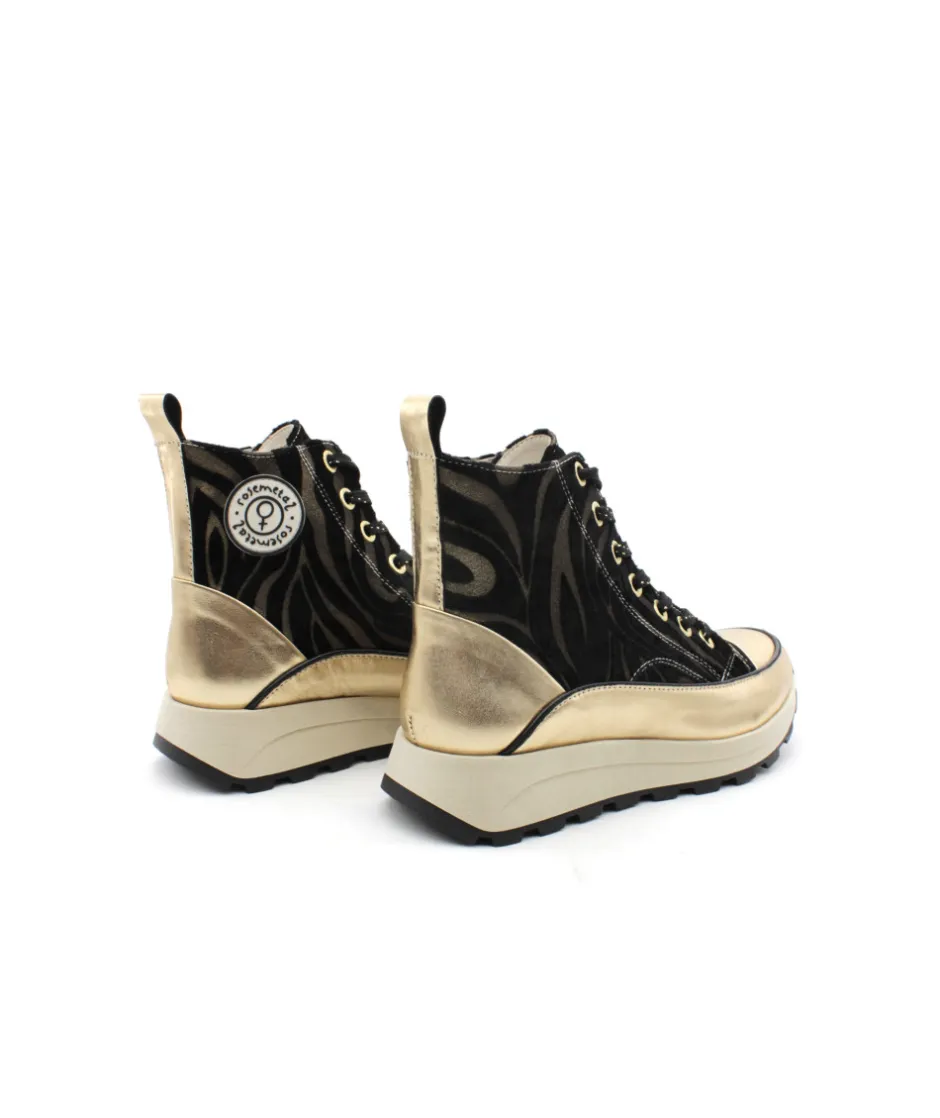 FRESSE H0793I, une basket ultra-originale pour un look tendance, voici la création de ROSEMETAL. Sur une semelle compensée et disponible en cuir noir, bronze et or, la mode est à vos pieds ! Avec une semelle beige imposante, des oeillets et une languette sur le contrefort doré,… pas de doute c’est le must-have de la saison ! Confortable et looké, on aime la portée à toutes les occasions !