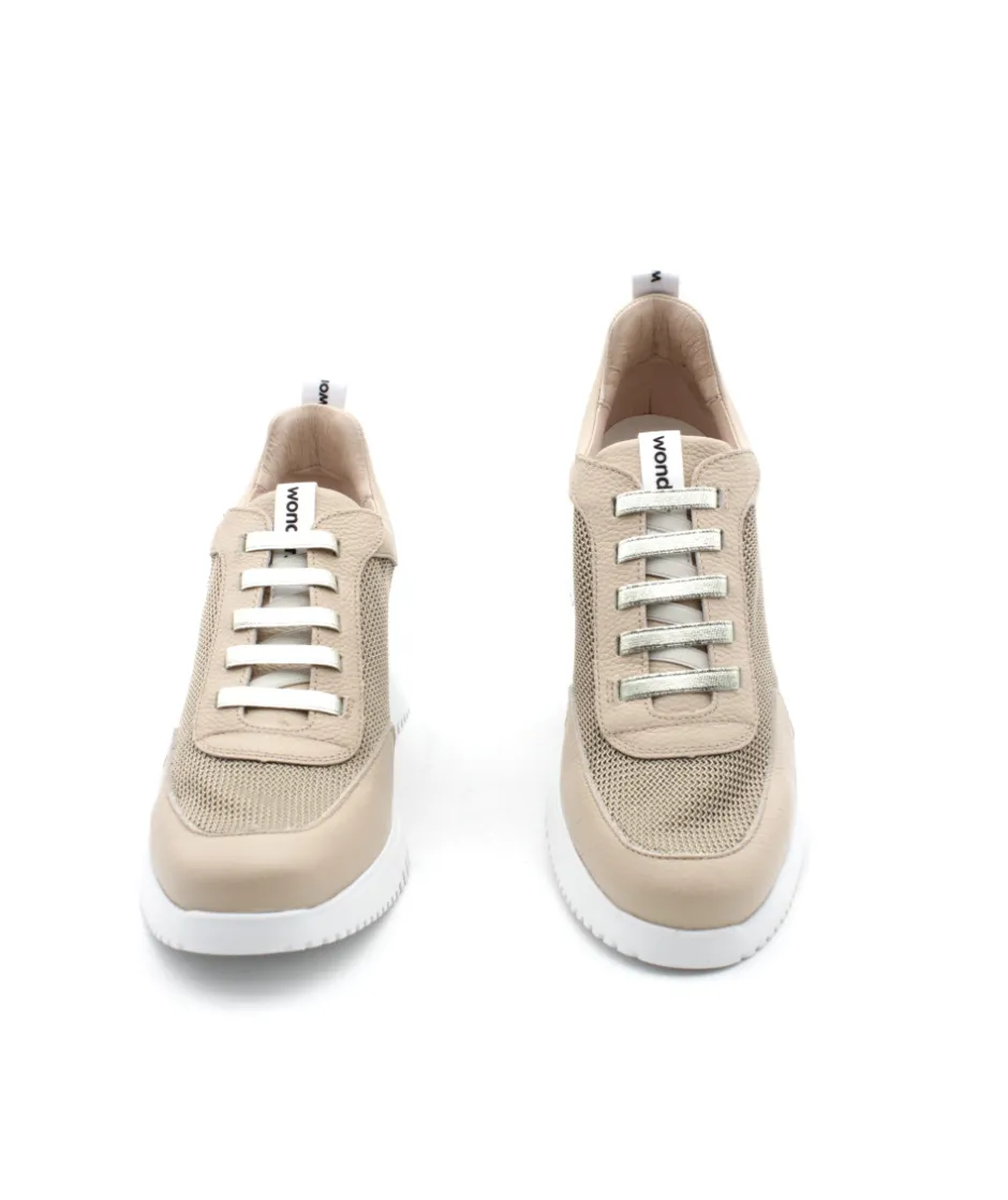 À la recherche d’une sneakers audacieuse qui ne manque pas d’originalité ? Voici pour vous la création G6604 en cuir et toile beige. Un look atypique associé à une semelle blanche au talon imposant, le tout accompagné d’un contrefort couleur or, encore une superbe création de la maison espagnole Wonders. Chez L’Empreinte, on est fan du mélange de matière qui lui offre un style sport chic.