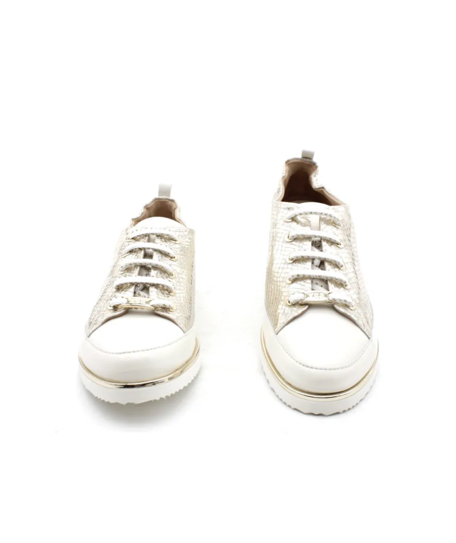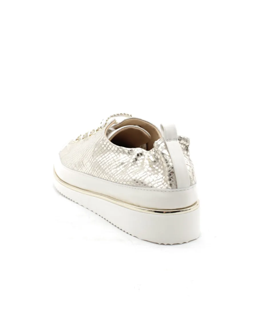 Sublime basket de la célèbre marque italienne XSA. Ce nouveau modèle unique 8010 dans un mélange de cuir python platine or et blanc fait déjà son effet auprès des modeuses à la recherche de légèreté et d’un confort absolu !