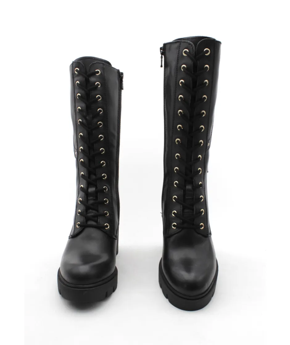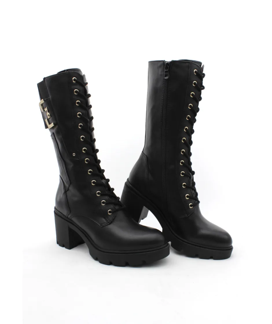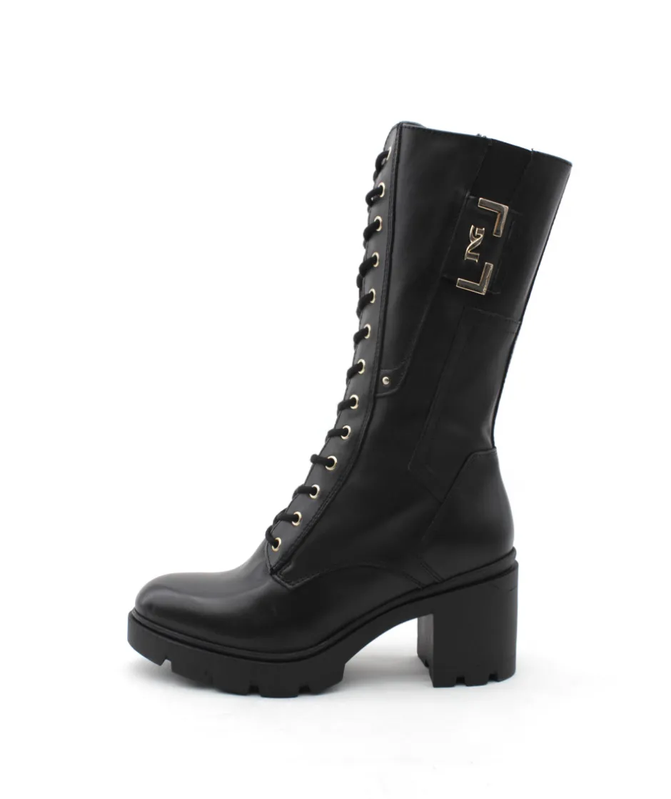 Magnifique botte pour femme en cuir noir. Voici la dernière création de la maison italienne Nerogiardini avec sa botte à lacets I205862D. Une création toute en élégance, à l’image du savoir faire italien. Perchée sur un talon de 7 cm, cette chaussure pour femme s’équipe d’un zip intérieur et de son logo version boucle décorative apposé sur le haut de la tige. Facile à enfiler grâce à son zip, vous pourrez les porter tous les jours avec chacune de vos tenues… Robes, Jeans et jupes ne seront pas en reste avec cette chaussure tendance et féminine.