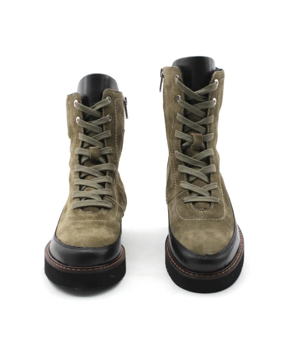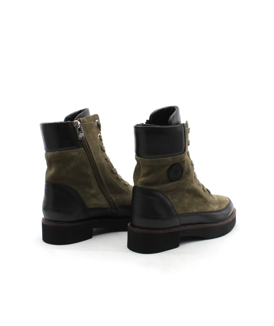 Nouvelle création de la maison française Emilie Karston ! La bottine OLAS en cuir velours kaki séduit déjà par son look novateur. Avec sa semelle en gomme lisse, ses empiècements en cuir noir sur le pourtour de la chaussure, sa tige et son contrefort, pas de doute, elle prendra la place de vos chaussures préférées. Pratique avec son zip intérieur et ses lacets, les bottines OLAS est le must have de la collection.