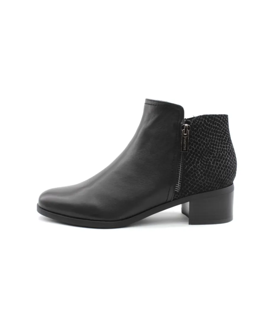 Fugitive fait son retour cette saison avec le modèle Racine. Indémodable, cette boots est le compromis parfait pour tout les jours avec son cuir noir. Légère, souple et confortable, plus besoin de venter ce modèle qui a déjà fait ses preuves ! L’arrière de la bottine a changé de look avec un empiècement en cuir imitation serpent pour plus d’originalité. Son talon de 4 cm offre la cambrure parfaite tandis que son zip intérieur vous facilitera l’enfilage.