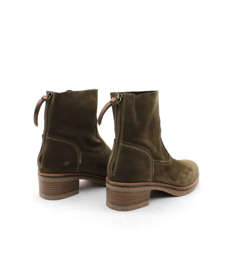 Jolie bottine de la maison MKD en cuir velours kaki. Voici le modèle PABLO OLIO et son talon décroché de 5 cm qui vous fera prendre de la hauteur tout en conservant une cambrure confortable. Son cuir souple, agréable à porter s’équipe d’un zip arrière pour plus de praticité. Sa semelle crêpe offre quant-à elle beaucoup d’amorti pour un confort de marche optimal.