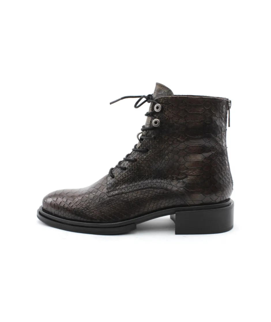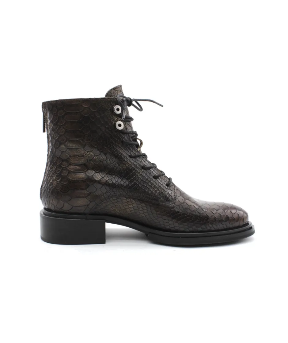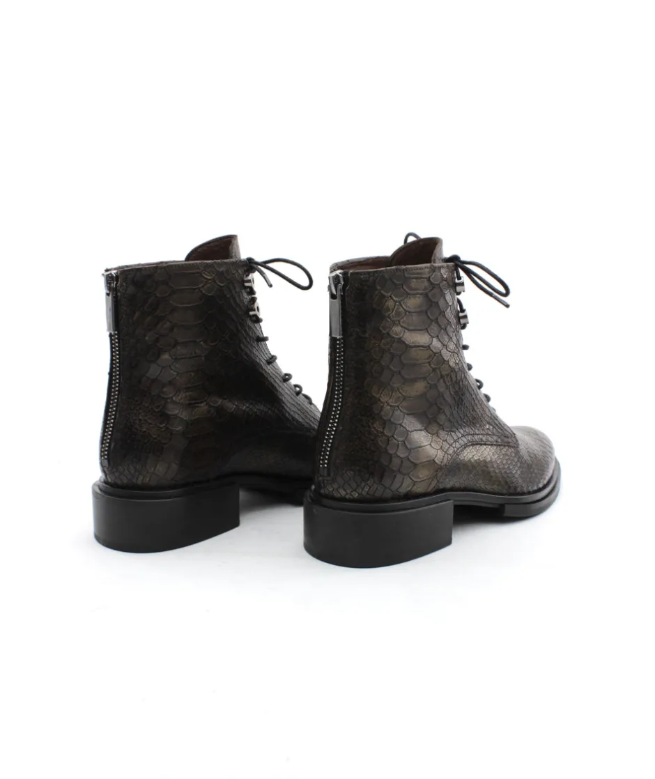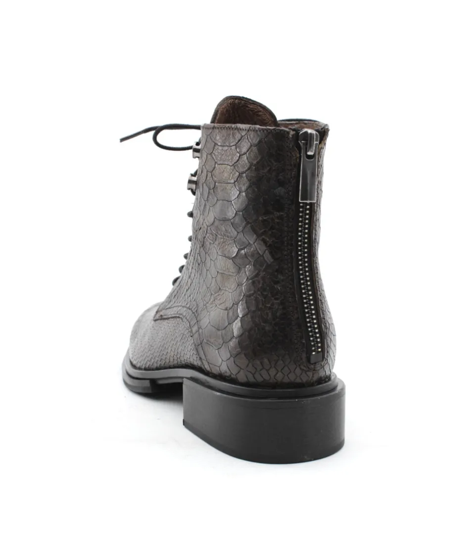 MURATTI propose cette saison une nouvelle bottine. RONAI, la petite dernière de la collection, se décline dans un sublime cuir aux impressions serpent kaki. Équipé d’un joli lacet rond ciré et d’oeillets métalliques sur le haut de la tige, on aime cette bottine pour son look chic et féminin. Son zip intérieur vous facilitera l’enfilage tandis que son lacet ajustera la bottine à votre pied. Intemporel mais toujours aussi indispensable elle mérita sa place dans votre shoesing cet hiver.