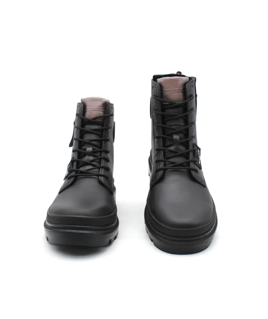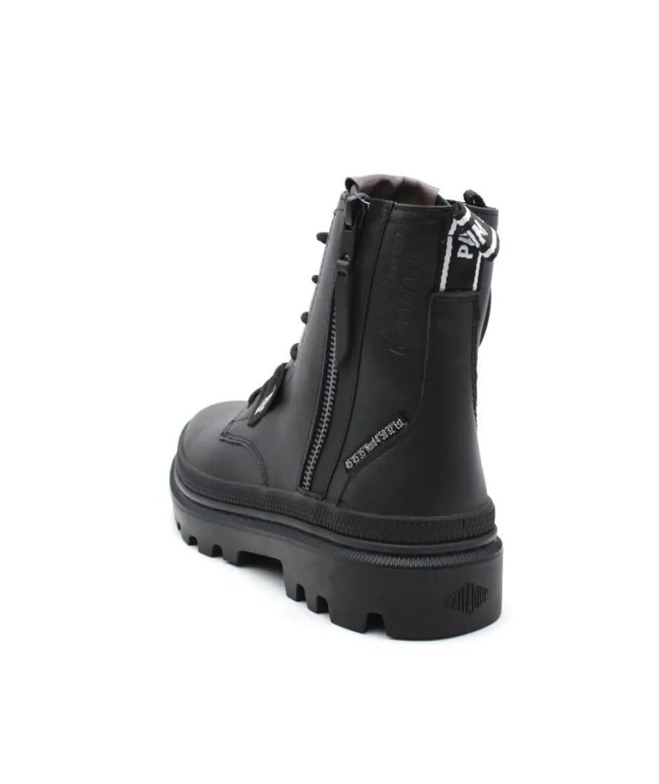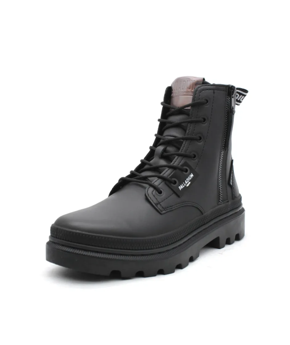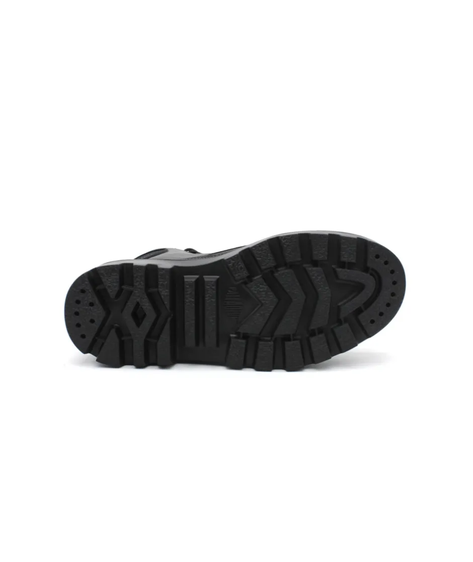 Palladium revient en force cette saison avec son nouveau modèle PALLATROOPER ZIP L en cuir noir. Une bottine au look ranger qui donne un style rock à vos tenues ! Sa semelle épaisse en caoutchouc, ses lacets ronds et son zip extérieur, lui donnent un charme fou… Palladium revient sur ces premiers designs en y apposant fièrement son logo sur différentes parties de la chaussure afin d’apporter une touche moderne à une collection rétro, très tendance.