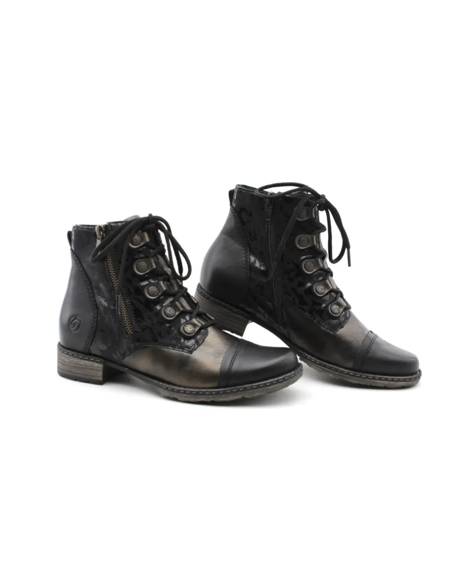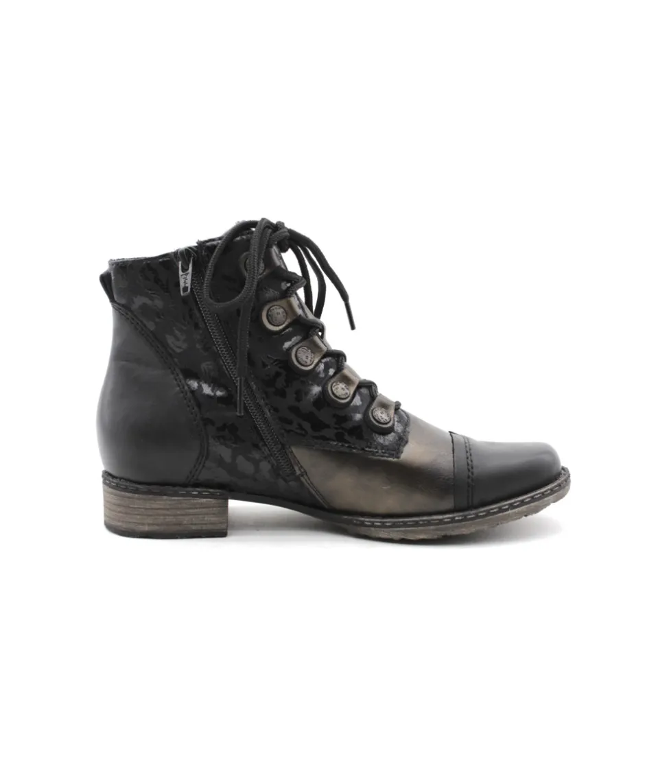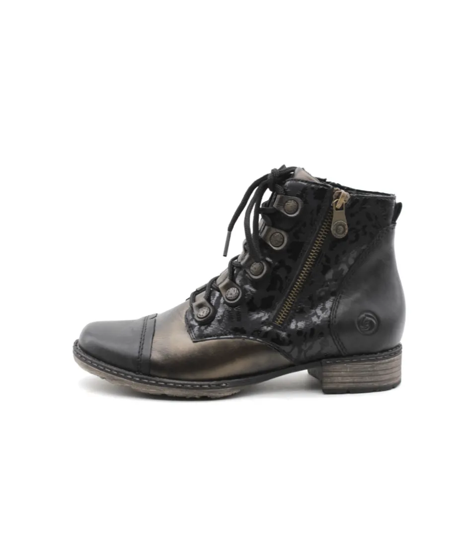 Remonte D4391-02 est une bottine femme en cuir et textile noir. Cette bottine Remonte est facile à chausser grâce à sa fermeture éclair et son lacet. Cette bottine Remonte est doté d’une semelle amovible. Parfaite pour accompagner vos tenues d’hiver. On aime également la tige fantaisie aux détails argentés et son cuir bronze tendance !