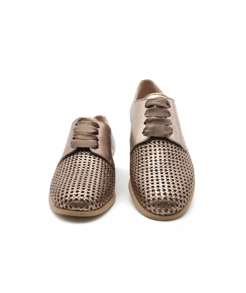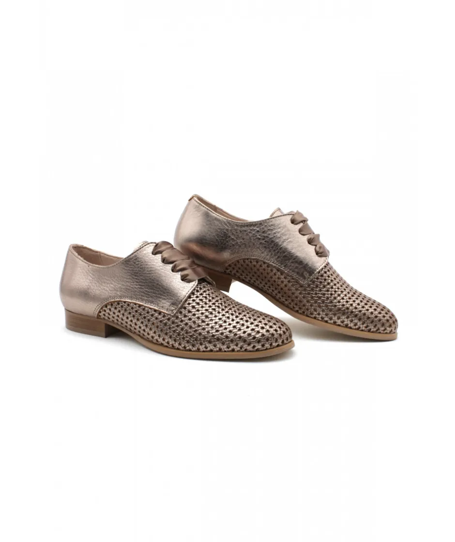 À la recherche d’un joli derbie pour femmes ? Voici le nouveau modèle 5321/00 de la marque MYMA sur un magnifique cuir métallisé bronze. Sur un talon de 2 cm et une semelle en élastomère pour plus de légèreté, c’est le derbie parfait pour cet été.