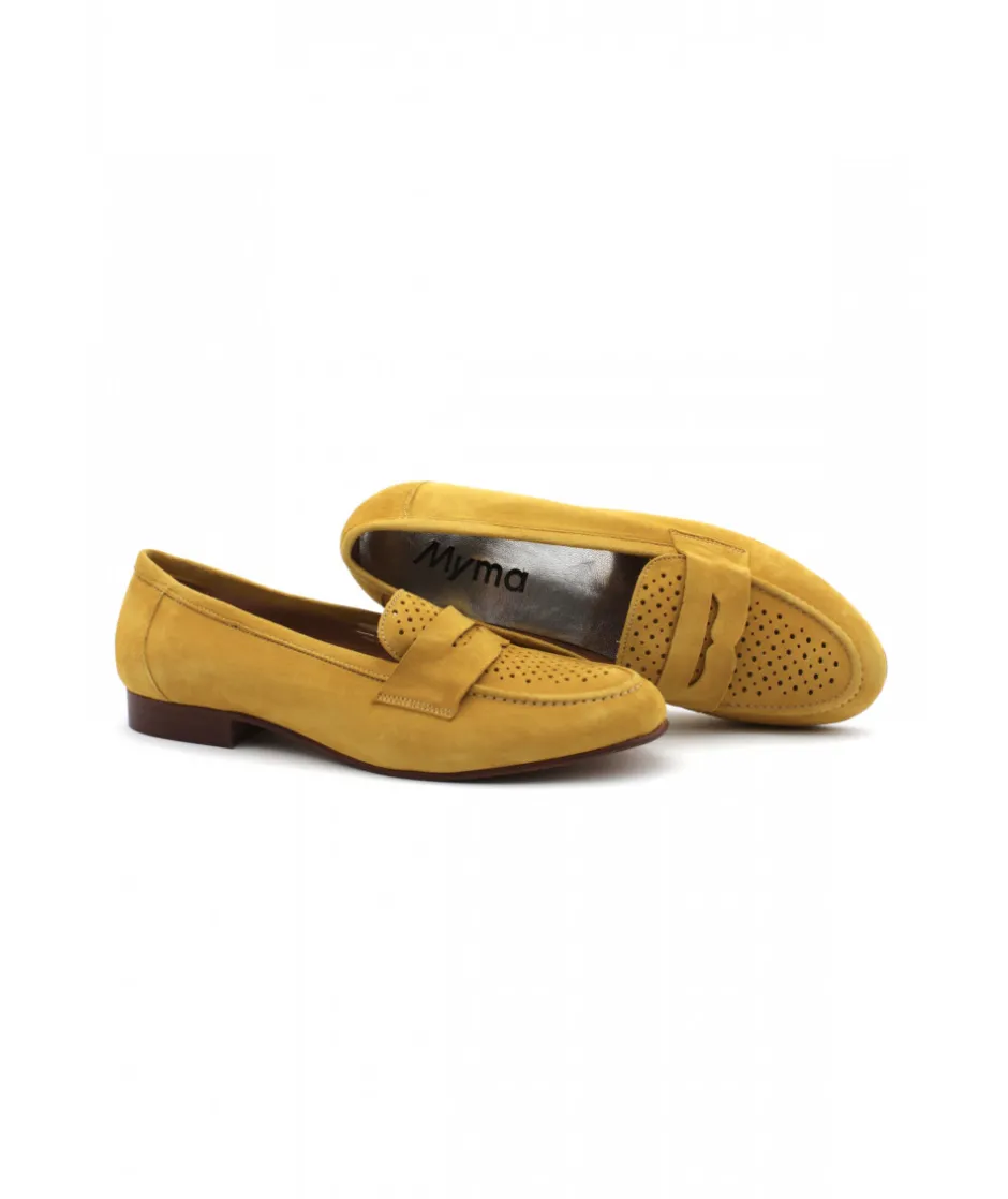 Joli mocassin en cuir velours perforé jaune chic et confortable. L’Empreinte Chaussures vous dévoile le nouveau modèle 5415/00 de la maison française MYMA et qui plaît déjà aux femmes à la recherche de modernité et d’élégance. Ce mocassin est une véritable pépite avec sa semelle fine en gomme pour sa légèreté et son confort ainsi que sa patte sur le dessus du pied pour un rendu féminin.