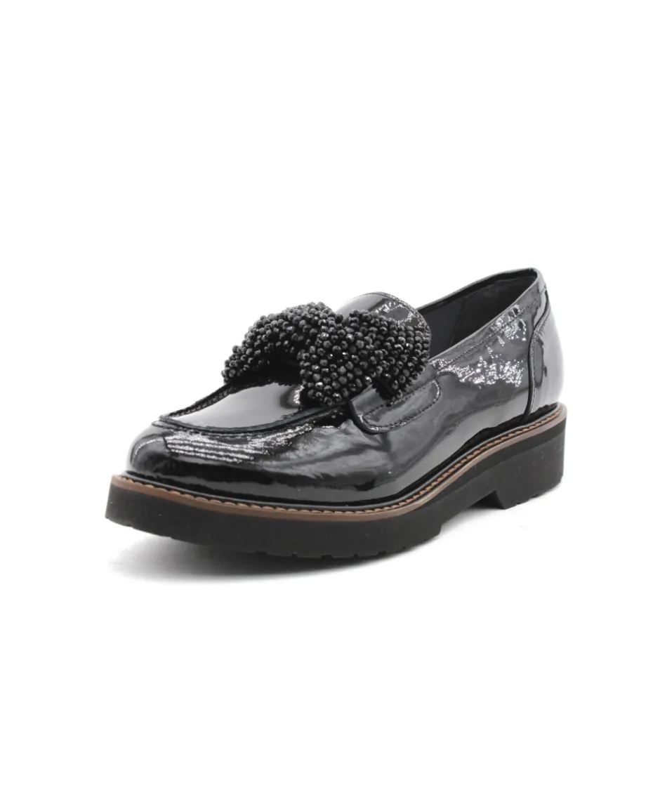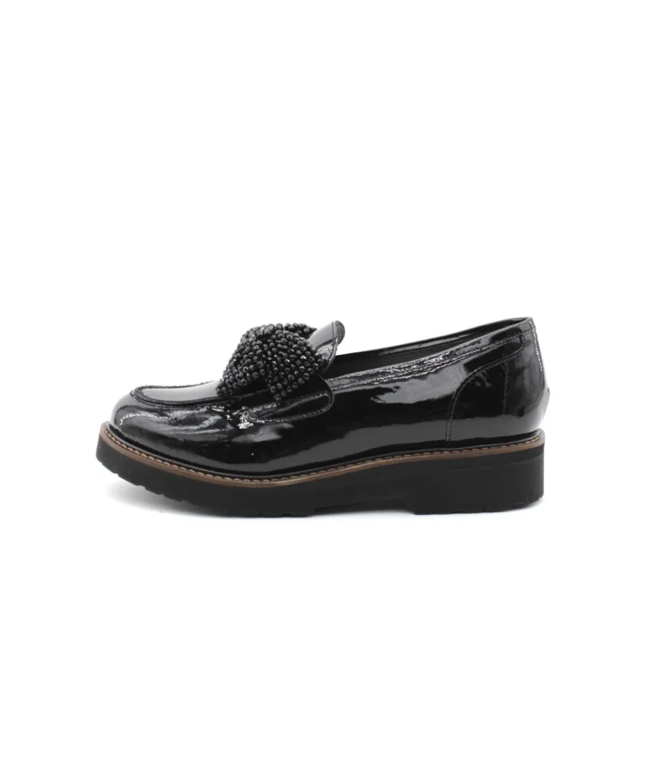 Nouvelle création de la maison française Myma avec ce mocassin en cuir vernis noir 5815/00. Un look moderne et féminin grâce à sa semelle épaisse, son cuir vernis et son noeud orné de strass. Énorme tendance, le mocassin se fait une place de choix dans le shoesing des femmes ces dernières années. Chic et raffiné, comme vous, ces chaussures s’associeront facilement à vos robes, jupes, pantalons à pinces…