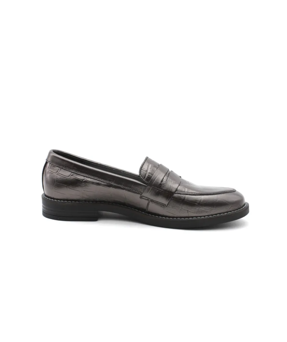 Nouvelle création de la maison française Myma avec ce mocassin en cuir anthracite 7000/01. Un look indémodable et élégant grâce à sa ligne raffinée, sa patte sur le plateau avant et son cuir version écaille croco. Énorme tendance, le mocassin se fait une place de choix dans le shoesing des femmes ces dernières années. Chic et moderne, comme vous, ces chaussures s’associeront facilement à vos robes, jupes, pantalons à pinces…