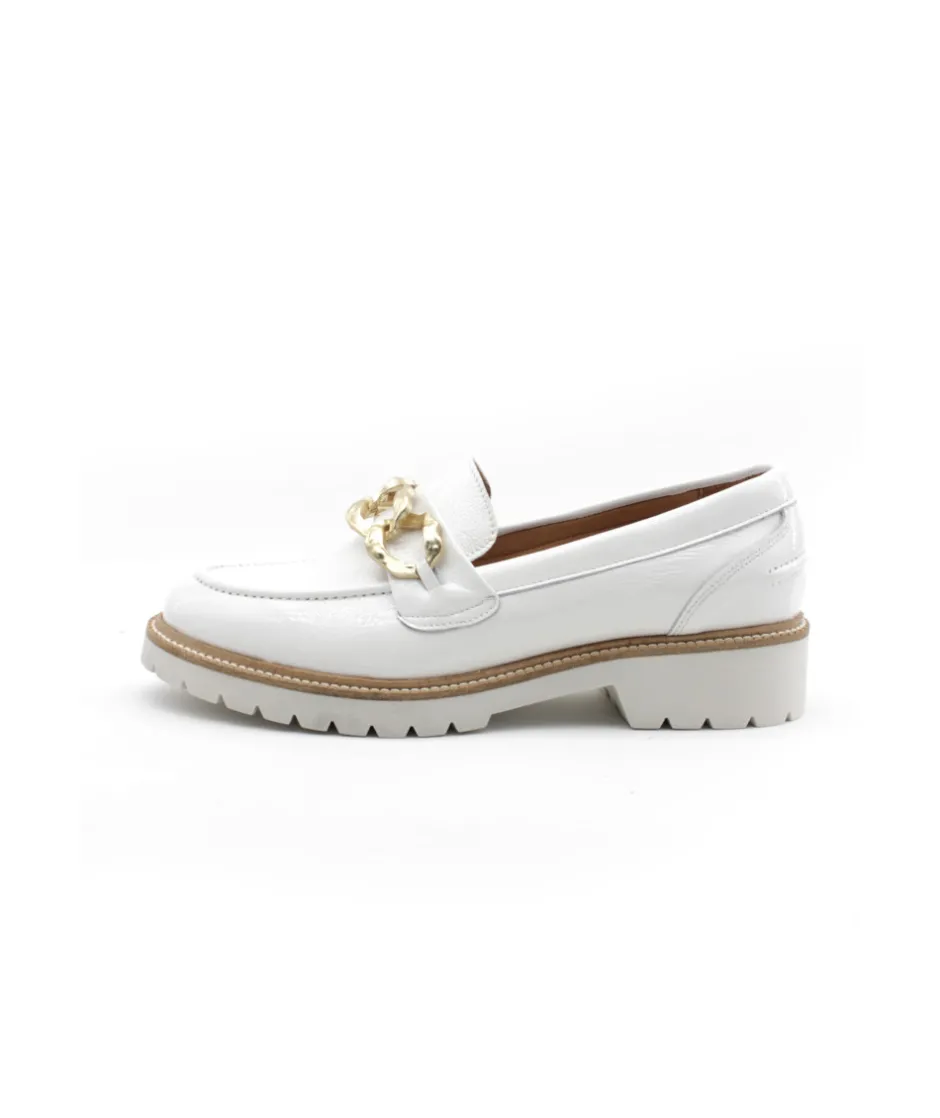 Nouvelle création de la maison française Myma avec ce mocassin en cuir vernis blanc 7518/01. Un look moderne grâce à sa semelle épaisse crantée, son cuir vernis et les bijoux présent sur le plateau. Énorme tendance, le mocassin se fait une place de choix dans le shoesing des femmes ces dernières années. Chic et raffiné, comme vous, ces chaussures s’associeront facilement à vos robes, jupes, pantalons à pinces…