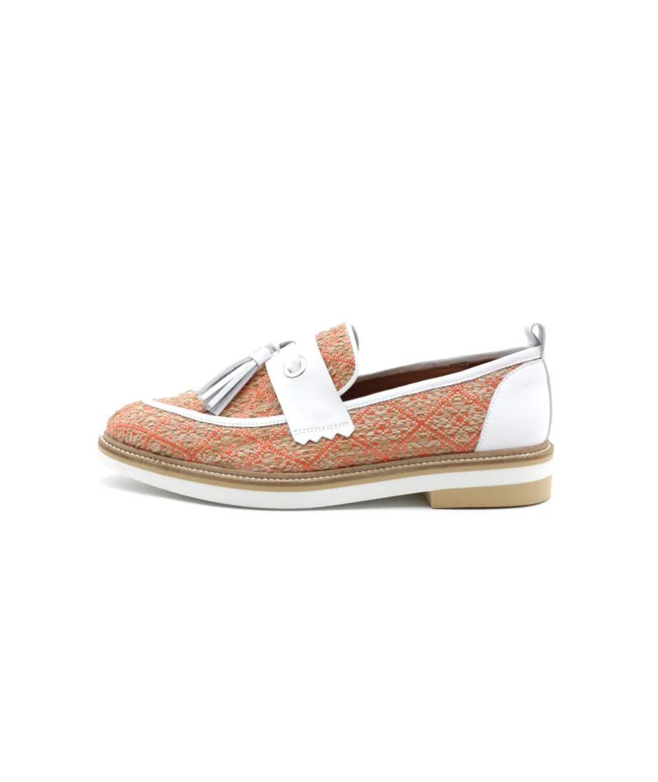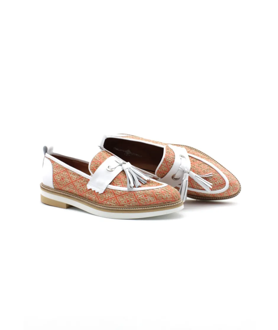 Sublime mocassin hors norme. Une création du designer breton Philippe Morvan en cuir et textile couleur orange associé à des détails blanc pour un rendu ultra élégant ! À porter sans modération, cette chaussure pour femme à la recherche de légèreté et de modernité est le must have de la collection. Chez l’Empreinte on est fan de ce look atypique et des glands présent sur le plateau.