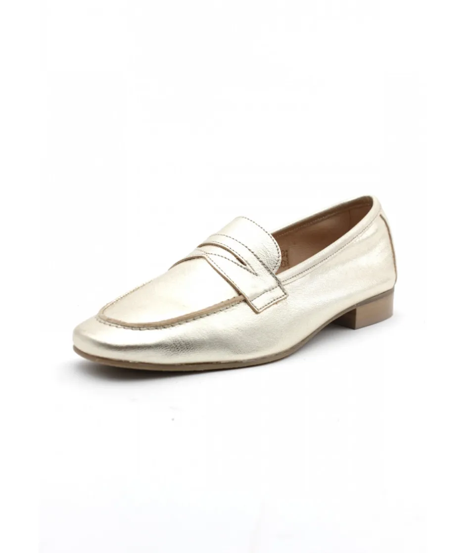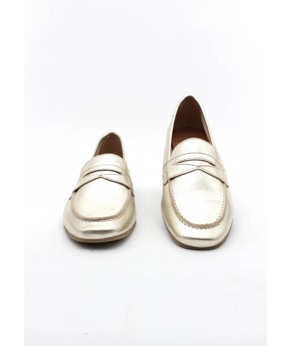 WE DO, une nouvelle marque chez L’Empreinte Chaussures, propose cette saison un mocassin très féminin en cuir platine or, décoré d’un empiècement en cuir chic sur le dessus du plateau.