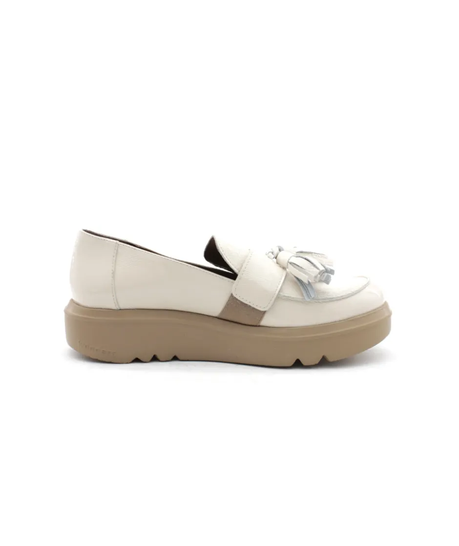 Joli mocassin en cuir vernis écrue et noir proposé par la maison espagnole Wonders. Le modèle A2803 casse les codes pour un look original et atypique, montée sur une semelle compensée, cette chaussure vous accompagnera partout grâce à son confort de marche. On aime les glands en cuir présent sur le plateau avant qui apporte de l’élégance au mocassin.